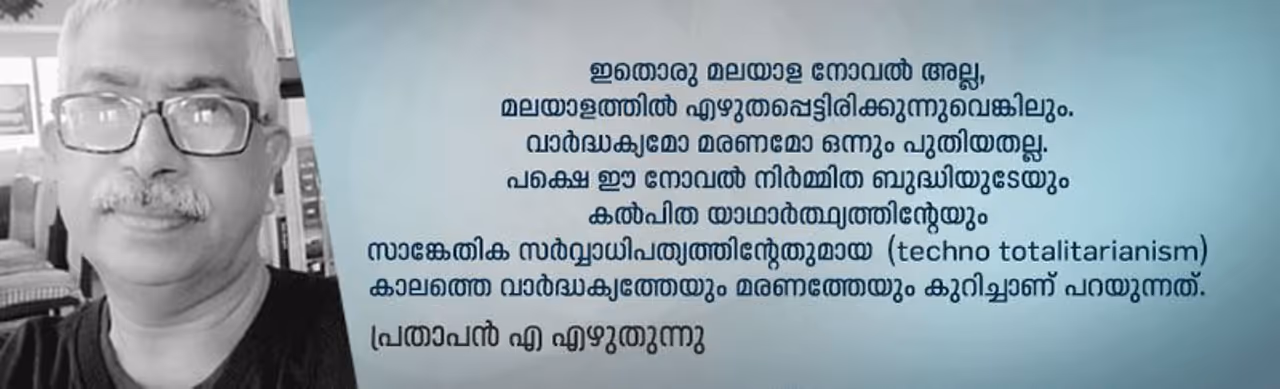 ഇതൊരു മലയാള നോവല് അല്ല, മലയാളത്തില് എഴുതപ്പെട്ടിരിക്കുന്നുവെങ്കിലും. വാര്ദ്ധക്യമോ മരണമോ ഒന്നും പുതിയതല്ല. പക്ഷെ ഈ നോവല് നിര്മ്മിത ബുദ്ധിയുടേയും കല്പിത യാഥാര്ത്ഥ്യത്തിന്റേയും സാങ്കേതിക സര്വ്വാധിപത്യത്തിന്റേതുമായ (techno totalitarianism) കാലത്തെ വാര്ദ്ധക്യത്തേയും മരണത്തേയും കുറിച്ചാണ് പറയുന്നത്. സാമൂഹികത മരിച്ച ലോകത്ത്, മൂലധന സാങ്കേതികതയാല് പരിചരിക്കപ്പെടുന്ന ഏകാന്തതകളേയും വിയോഗങ്ങളെയും കുറിച്ച്.