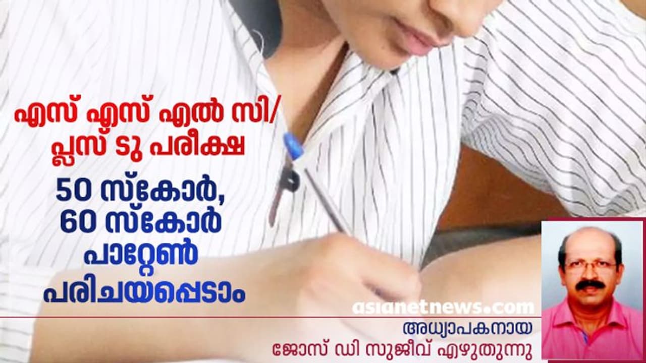 എസ് എസ് എൽ സി/പ്ലസ് ടു പരീക്ഷകൾക്ക് 80 സ്കോറിന്റെയും 40 സ്കോറിന്റെയും പാറ്റേൺ മനസ്സിലാക്കിയല്ലോ. ഇവിടെ നമുക്ക് 60 സ്കോറിന്റെയും 50 സ്കോറിന്റെയും പാറ്റേൺ പരിചയപ്പെടാം. ഈ വർഷത്തെ പരീക്ഷകൾക്ക് കുട്ടികൾ പരീക്ഷ എഴുതേണ്ട സ്കോറിനെക്കാൾ 50% സ്കോറിന് കൂടി അധിക ചോദ്യങ്ങൾ ലഭിക്കും. അതായത് 50 സ്കോറിന്റെ പരീക്ഷയ്ക്ക് 75 സ്കോറിന്റെ ചോദ്യങ്ങളും 60 സ്കോറിന്റെ പരീക്ഷയ്ക്ക് 90 സ്കോറിന്റെ ചോദ്യങ്ങളും ചോദ്യക്കടലാസിൽ ലഭിക്കും. ഈ അധികചോദ്യങ്ങൾ ചോയ്സുകളാണ്. എന്നുവച്ചാൽ 50 സ്കോറിന്റെ ചോദ്യപ്പേപ്പറിൽ 25 സ്കോറിന്റെ ചോദ്യങ്ങൾ ചോയ്സുകളായിരിക്കും. 60 സ്കോറിന്റെ ചോദ്യപ്പേപ്പറിൽ 30 സ്കോറിന്റെ ചോദ്യങ്ങൾ ചോയ്സുകളായിരിക്കും. 50 മാർക്കിന്റെ പരീക്ഷയ്ക്ക് ആകെ 29 ചോദ്യങ്ങളും 60 മാർക്കിന്റെ പരീക്ഷയ്ക്ക് ആകെ 36 ചോദ്യങ്ങളാകും ഉണ്ടാകുക.