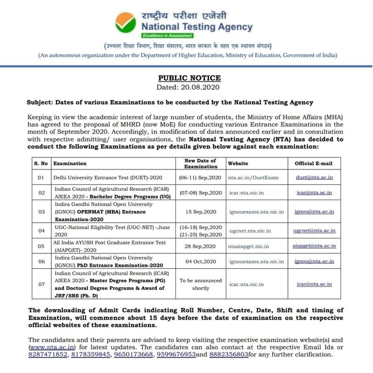 ദില്ലി: കൊവിഡ് വ്യാപനത്തിന്റെ പശ്ചാത്തലത്തിൽ മാറ്റിവച്ച യുജിസി നെറ്റ് അടക്കമുള്ള ഏഴ് പരീക്ഷകളുടെ തീയ്യതി പ്രഖ്യാപിച്ചു. നെറ്റ് പരീക്ഷ അടുത്ത മാസം 16 മുതൽ 18 വരെയും 21 മുതൽ 25 വരെയുമായി നടത്തും. ദില്ലി സർവ്വകലാശാല പ്രവേശന പരീക്ഷ അടുത്ത മാസം ആറ് മുതൽ പതിനൊന്ന് വരെ നടക്കും.