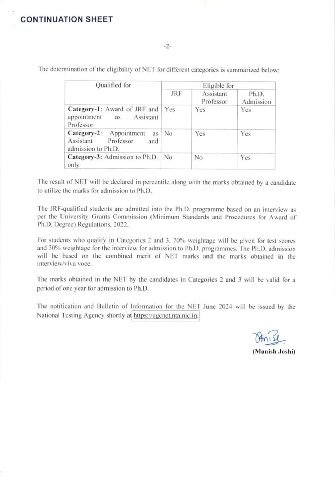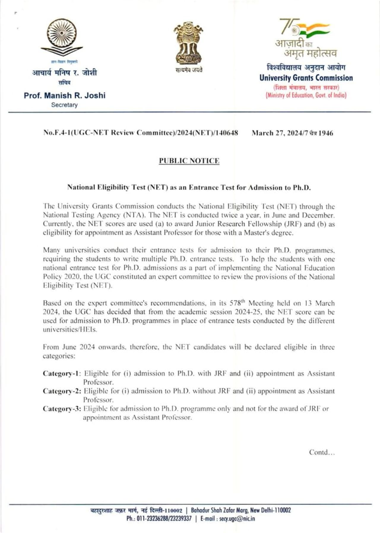 2020ലെ ദേശീയ വിദ്യാഭ്യാസ നയം നടപ്പാക്കുന്നതിന്റെ ഭാഗമായി വിദഗ്ധ സമിതിയുടെ നിര്ദേശ പ്രകാരമാണ് പുതിയ തീരുമാനം.വര്ഷത്തില് ജൂണ്, ഡിസംബര് മാസങ്ങളിലായി രണ്ടു തവണയാണ് നെറ്റ് പരീക്ഷ നടക്കുന്നത്. പുതിയ പരിഷ്ക്കാരത്തോടെ സർവകലാശാലകൾ നേരിട്ട് നടത്തുന്ന പി എച്ച് ഡി എൻട്രൻസ് പരീക്ഷകൾ ഇല്ലാതെയാകുമെന്ന് അക്കാദമിക്ക് രംഗത്തെ വിദഗ്ധർ അഭിപ്രായപ്പെട്ടു.