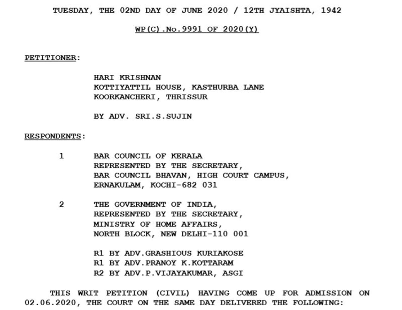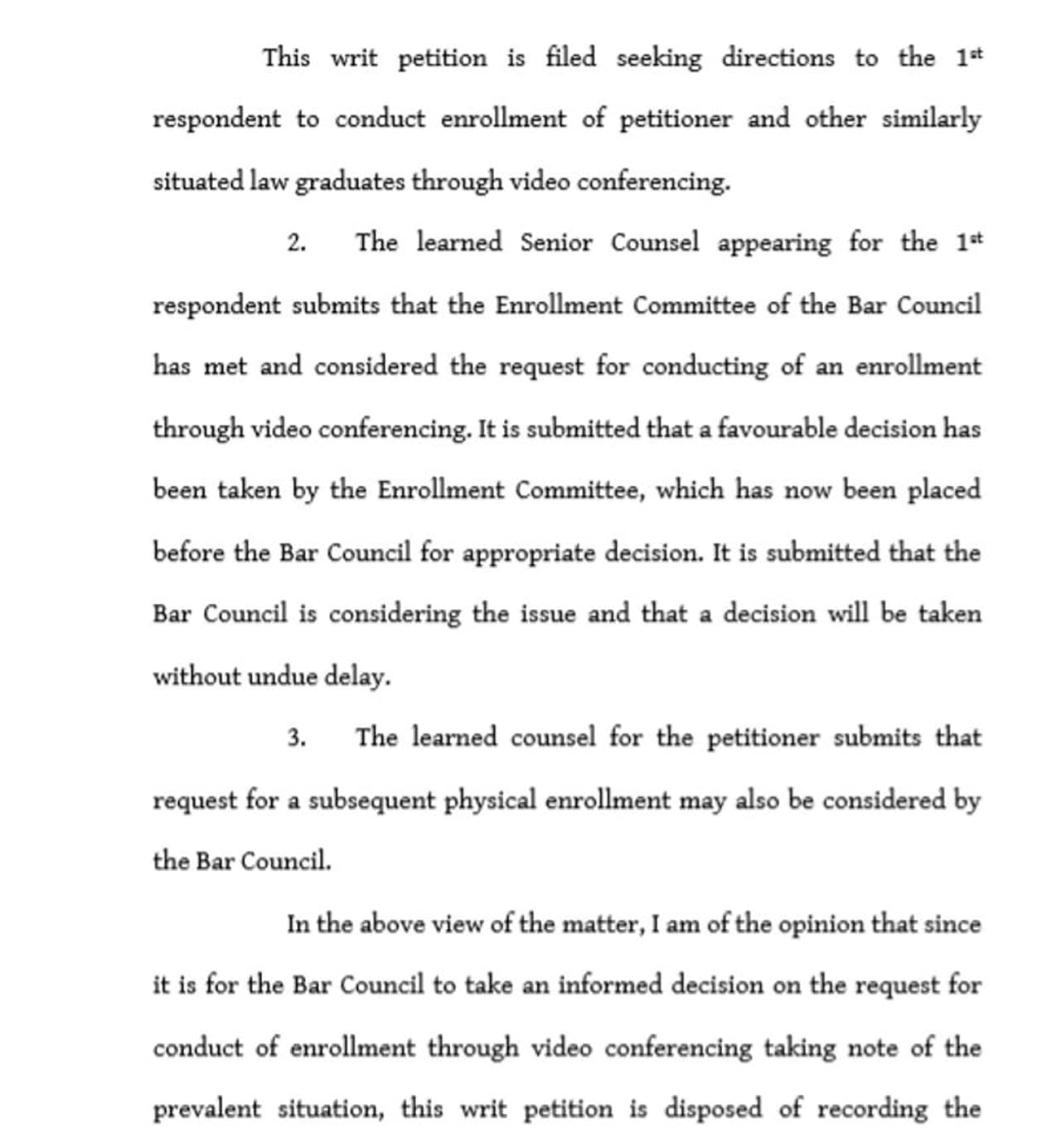 തിരുവനന്തപുരം: കൊറോണ വൈറസ് വ്യാപനത്തെ തുടർന്ന് ലോക്ക് ഡൗൺ പ്രഖ്യാപിച്ച സാഹചര്യത്തിൽ അഭിഭാഷകരുടെ വിർച്വൽ എൻറോൾമെന്റ് നടത്താൻ തീരുമാനിച്ച് കേരള ബാർ കൗൺസിൽ. നിയമബിരുദധാരിയായ തൃശൂർ കൂർക്കഞ്ചേരി സ്വദേശി ഹരികൃഷ്ണൻ കെ. ഹൈക്കോടതിയിൽ സമർപ്പിച്ച റിട്ട് ഹർജിയിൻ മേലാണ് വിധി വന്നിരിക്കുന്നത്. ലോക്ക് ഡൗൺ പ്രഖ്യാപിച്ചിരിക്കുന്നതിനാൽ നിയമ ബിരുദം പൂർത്തിയാക്കിയ ആയിരക്കണക്കിന് വിദ്യാർത്ഥികൾക്കാണ് എൻറോൾമെന്റെ് നടത്താൻ സാധിക്കാതെ വന്നിരിക്കുന്നത്.