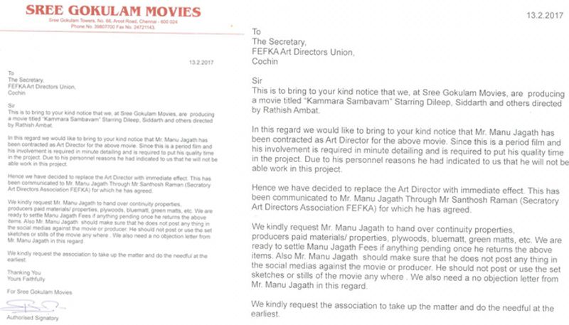 ചിത്രീകരണം തുടങ്ങിയ ദിവസം മുതല് പ്രൊഡക്ഷനുവേണ്ടി വാങ്ങിയ പണത്തിന്റെ കണക്ക് കൃത്യമായി നല്കുന്നതില് മനു വീഴ്ച വരുത്തിയിരുന്നു. ഈ വിഷയം ശ്രദ്ധയില്പ്പെടുത്തിയ ലൈന് പ്രൊഡ്യൂസറുമായി തര്ക്കത്തിലുമായിരുന്നു. 2016 ഓഗസ്റ്റ് 18ന് ചിത്രീകരണം തുടങ്ങിയ സിനിമയുടെ കലാസംവിധാനത്തിന്റെ ഏകദേശ ബജറ്റ് മനു നിര്മ്മാതാവിന് ഇമെയില് ചെയ്യുന്നത് 2017 ജനുവരി 26നാണ്. നേരത്തേ പറഞ്ഞത് പ്രകാരം മൂന്ന് ഷെഡ്യൂളുകളിലായി 24 ദിവസം വര്ക്ക് ചെയ്ത അദ്ദേഹം തനിക്ക് സാമ്പത്തികപ്രതിസന്ധി ഉണ്ടെന്നും കമ്മാരസംഭവത്തില് ഇനി തുടരണമെങ്കില് പറഞ്ഞുറപ്പിച്ചതിന് പുറമെ പ്രതിമാസം രണ്ട് ലക്ഷം തരണമെന്നും എന്നോടും പ്രൊഡക്ഷന് കണ്ട്രോളറോടും ആവശ്യപ്പെട്ടു. അല്ലാത്തപക്ഷം മറ്റൊരാളെ നോക്കിക്കൊള്ളാനും. ഈയാവശ്യം ഉന്നയിച്ച് 2016 ഡിസംബര് ഏഴിന് അദ്ദേഹം പ്രൊഡ്യൂസര്ക്ക് ഇമെയില് അയച്ചു. പക്ഷേ അഡ്വാന്സ് വാങ്ങി ഒരു വര്ഷം കഴിഞ്ഞിട്ടും ബജറ്റ് നല്കാത്ത, വാങ്ങിയ പണത്തിന്റെ കണക്ക് കൃത്യമായി കൊടുക്കാത്ത ഒരു കലാസംവിധായകന് അധിക പ്രതിഫലം നല്കാന് നിര്മ്മാതാവ് തയ്യാറല്ലായിരുന്നു. പിന്നാലെ മറ്റൊരു കലാസംവിധായകനെ നിയമിക്കാനുള്ള അനുമതിക്കായി ഫെഫ്ക ആര്ട്ട് ഡയറക്ടേഴ്സ് അസോസിയേഷനെ നിര്മ്മാതാവ് സമീപിക്കുകയായിരുന്നു.