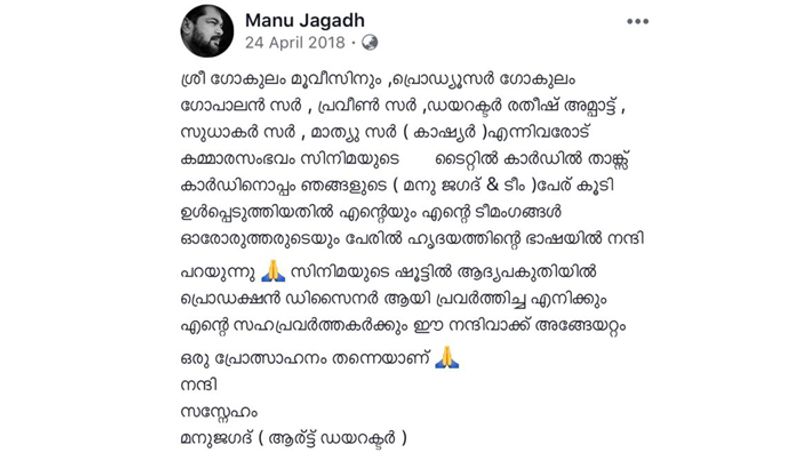'കമ്മാരസംഭവ'ത്തിന്റെ കലാസംവിധാനത്തില് 40 ശതമാനവും നിര്വ്വഹിച്ച തന്നെ താങ്ക്സ് കാര്ഡിലേക്ക് ഒതുക്കിയെന്നാണ് മനു ജഗത്തിന്റെ ആരോപണം?