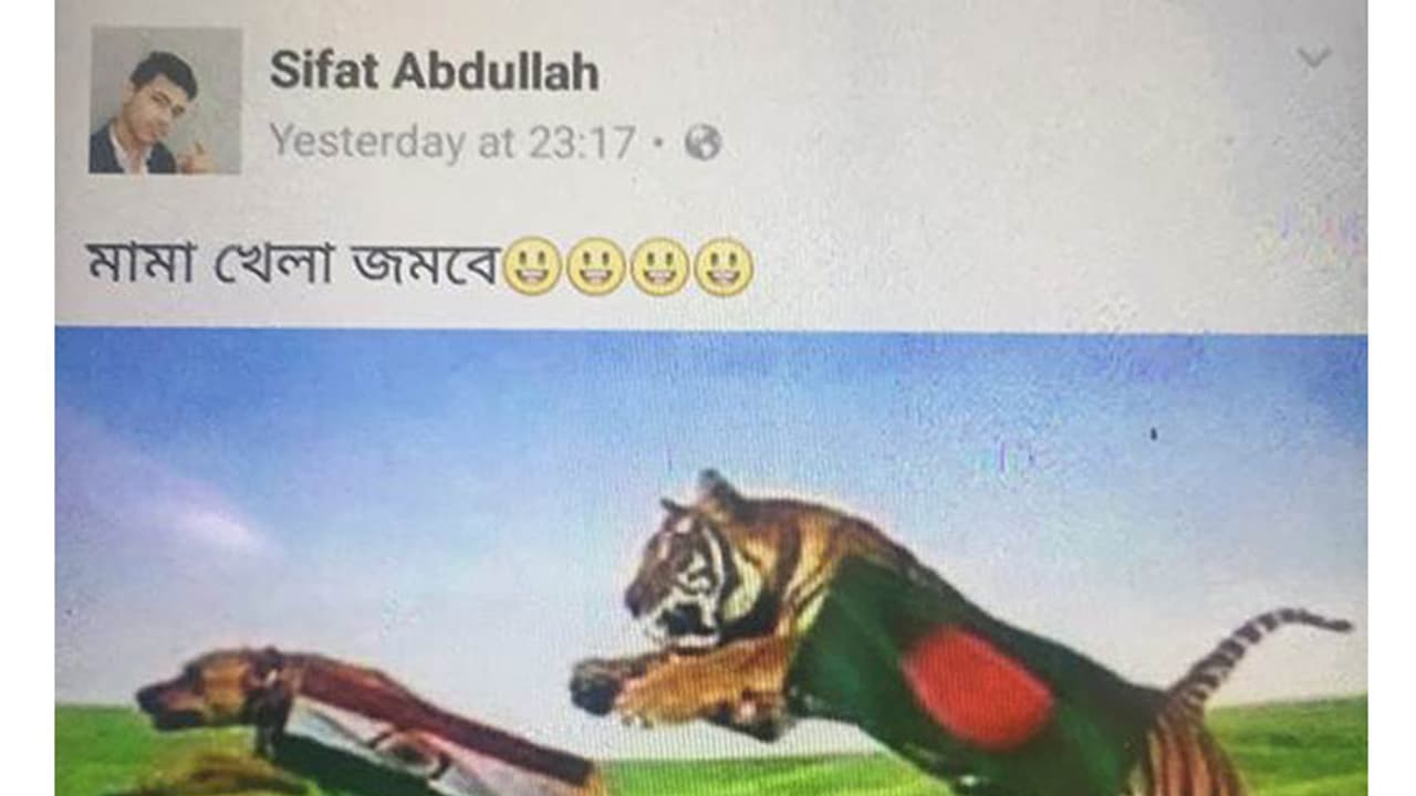 ഇന്ത്യന് പതാക ധരിച്ച പട്ടിയ്ക്ക് മുകളിലേക്ക് ബംഗ്ലാദേശിന്റെ പതാക പതിച്ച കടുവ ചാടി വീഴുന്ന ചിത്രമാണ് ഇത്തരത്തില് ബംഗ്ലാ ആരാധകര് വൈറലാക്കിയ ഒരു ചിത്രം.