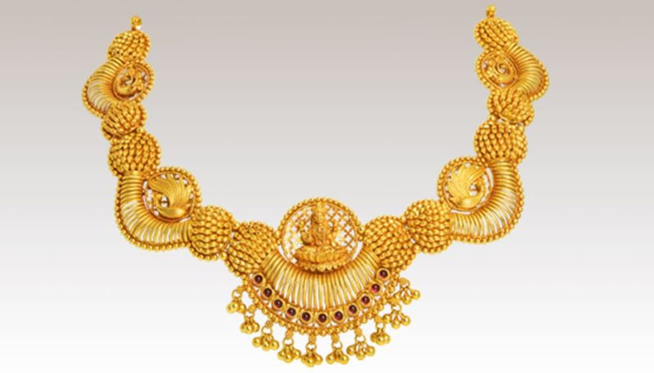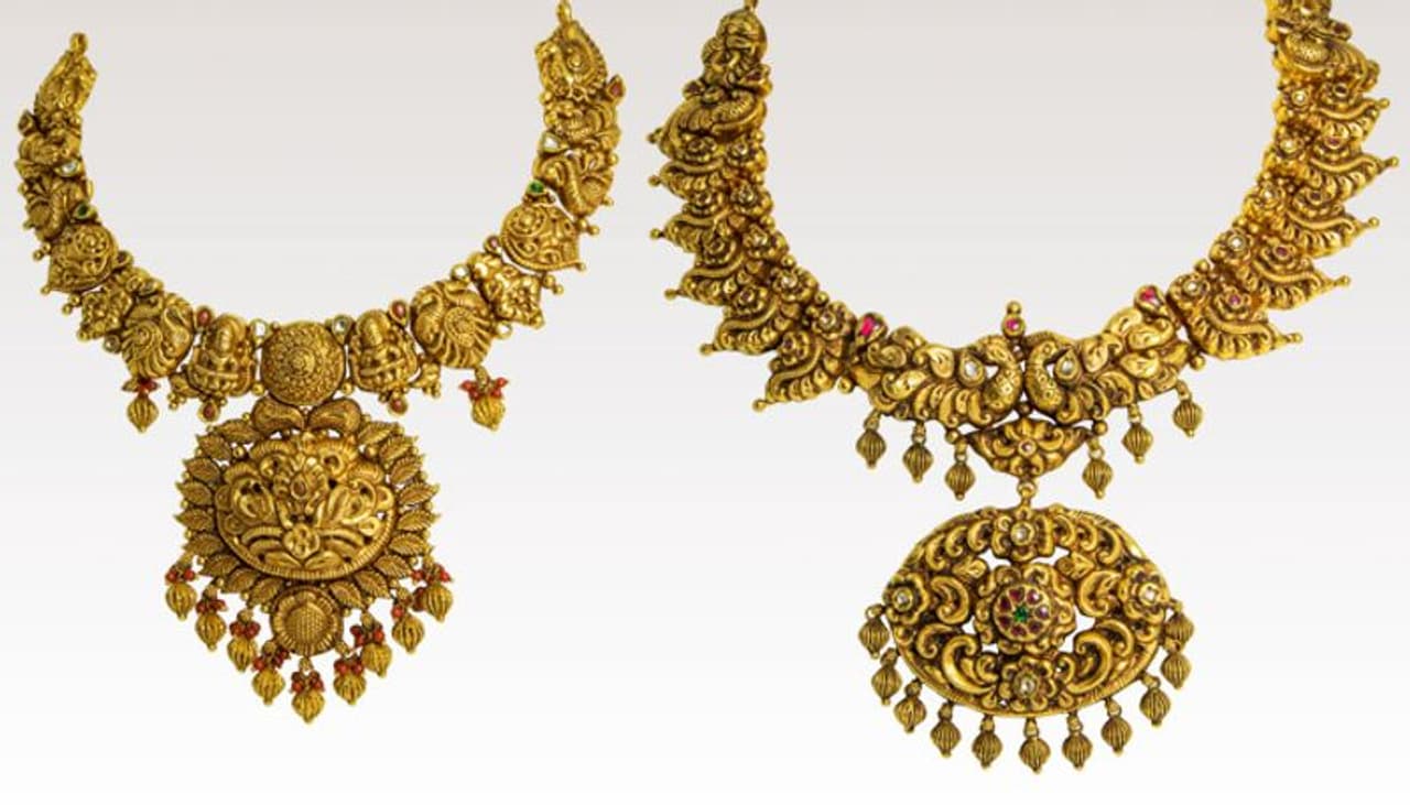പൂക്കൾക്കൊപ്പം സസ്യ ലതാതികളും മറ്റും ഭാരതത്തിലെ പാരമ്പരാഗത ആഭരണ ഡിസൈനുകളിൽ പ്രകടമാണ്. അരയന്നങ്ങളും, ആനകളും, മയിലുകളുമെല്ലാം നിറയുന്ന കാഴ്ചയിൽ ഭാരം തോന്നിക്കുന്ന നെക്ലേസ് ആണ് ഭീമയുടെ ആന്റിക്ക് ആഭരണങ്ങളിലെ മറ്റൊരു താരം. ഓക്സിഡിസൈഡ് സ്വർണ്ണം കൊണ്ട് നിർമ്മിച്ചിരിക്കുന്ന ഈ ആഭരണത്തിൽ പ്രെഷ്യസ് സ്റ്റോണുകൾ കൂടി ചേരുമ്പോൾ ഇവയ്ക്ക് ഒരു പ്രത്യേക ഭാവം തന്നെ കൈവരുന്നു. പരമ്പരാഗത ടെംപിൾ ആഭരണങ്ങൾ ഓർമിപ്പിക്കുന്ന മികവുറ്റ ഒരു ഡിസൈൻ ആണിത്.