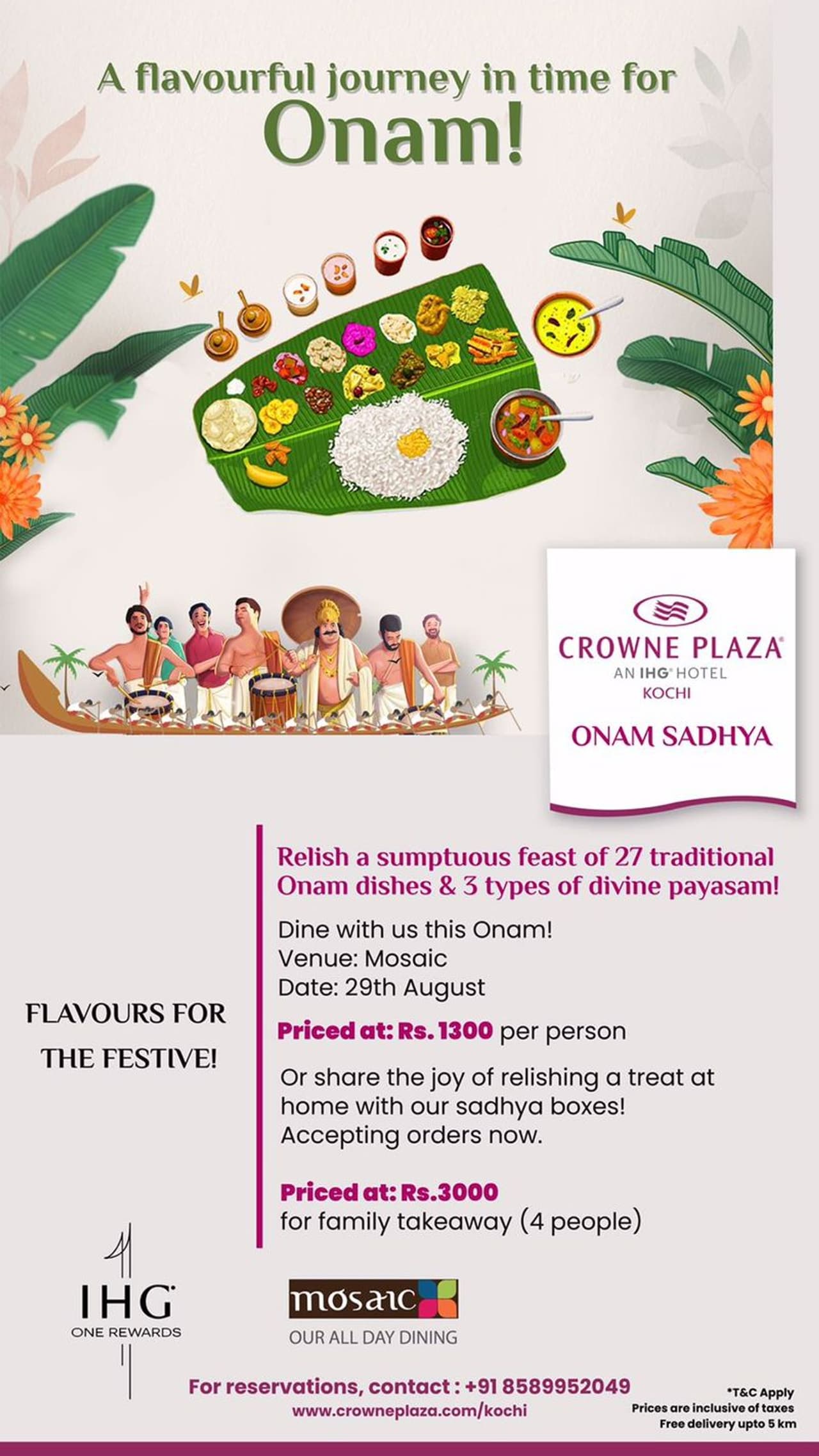 ഓഗസ്റ്റ് 29 തിരുവോണ ദിനത്തിൽ രുചിയേറിയ പരമ്പരാഗത ഓണസദ്യ വിരുന്നാണ് ക്രൗൺ പ്ലാസ, കൊച്ചി, മൊസൈക് റെസ്റ്റോറന്റിൽ ഒരുക്കുന്നത്. തിരുവോണ ദിവസം ഇവിടെ എത്തുന്ന അതിഥികൾക്ക് സ്വാദിഷ്ടവും രുചിയേറിയതുമായ 27 വിഭവങ്ങൾ അടങ്ങിയ ഇല സദ്യ കഴിക്കാം.