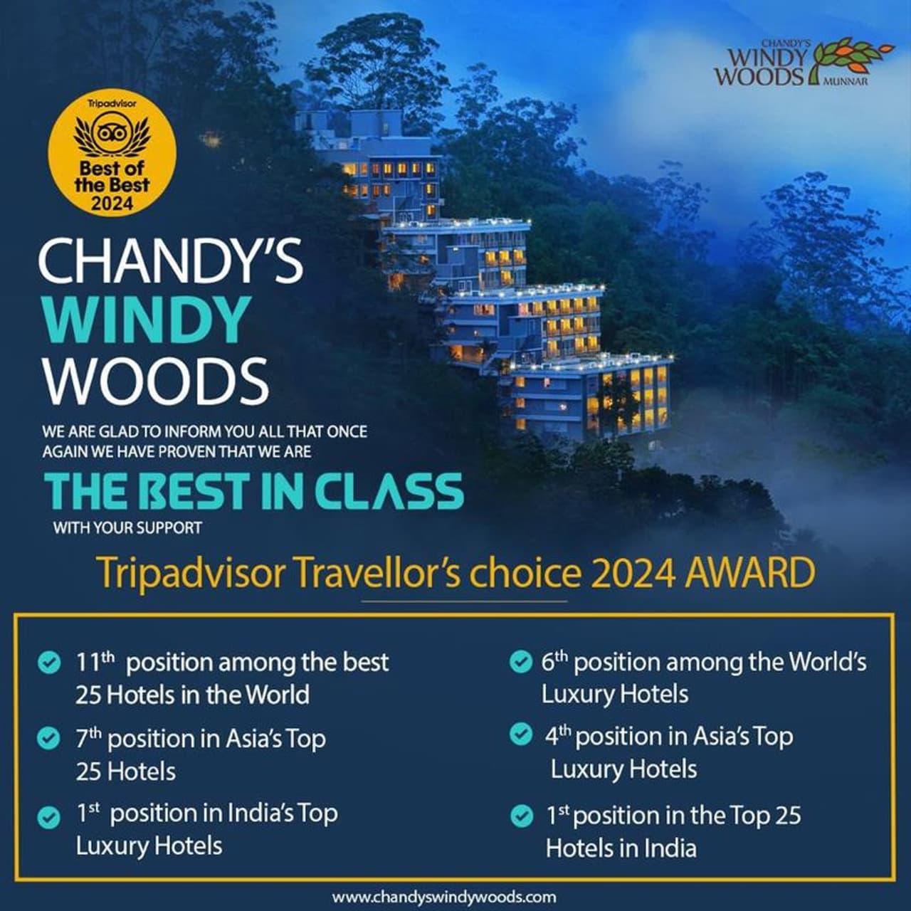 ലോകത്തിലെ ഏറ്റവും മികച്ച ജനപ്രിയ ഹോട്ടലുകളിൽ 11-ാം സ്ഥാനം നേടി ചാണ്ടീസ് വിൻഡി വുഡ്സ് തിരഞ്ഞെടുക്കപ്പെട്ടു. ട്രിപ് അഡ്വൈസർ ട്രാവലേഴ്സ് ചോയ്സ് 2024 അവാർഡിലാണ് നേട്ടം. ഇന്ത്യയിൽ നിന്ന് ഈ നേട്ടത്തിന് അർഹമായ ഏക ഹോട്ടൽ ആണ് ചാണ്ടീസ് വിൻഡി വുഡ്സ്.