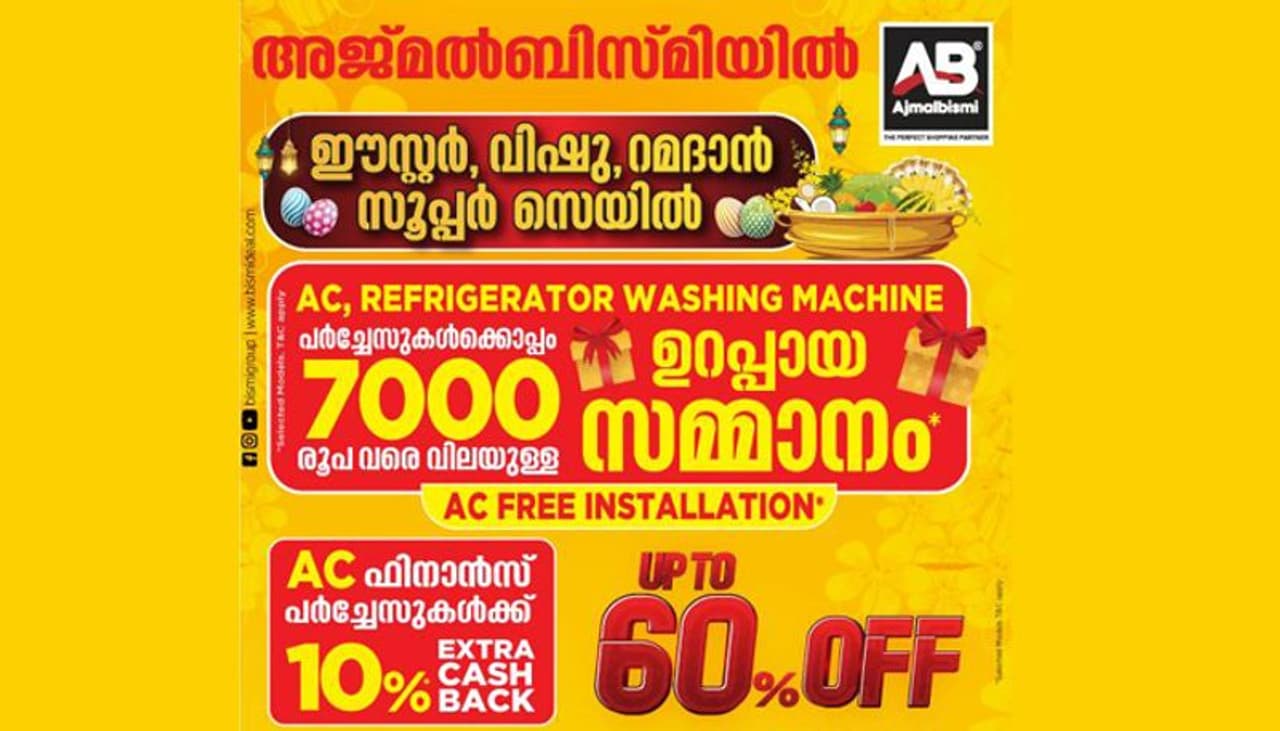 സൗത്ത് ഇന്ത്യയിലെ ഏറ്റവും വലിയ റീട്ടെയിൽ ഗ്രൂപ്പായ അജ്മൽബിസ്മിയിൽ 60% വിലക്കുറവിനൊപ്പം സമ്മാനങ്ങളുമായി ഈസ്റ്റർ, വിഷു, റമദാൻ സൂപ്പർ സെയിൽ! തിരഞ്ഞെടുത്ത എയർ കണ്ടീഷണർ, റെഫ്രിജറേറ്റർ, വാഷിംഗ് മെഷിൻ പർച്ചേസുകൾക്കൊപ്പം 7000 രൂപ വരെ വിലയുള്ള സമ്മാനമാണ് നിങ്ങളെ കാത്തിരിക്കുന്നത്. കൂടാതെ ഡെബിറ്റ് / ക്രെഡിറ്റ് കാർഡ് പർച്ചേസുകൾക്ക് 5% മുതൽ 20% വരെ ഇൻസ്റ്റന്റ് ക്യാഷ്ബാക്ക് ഒരുക്കിയിട്ടുണ്ട്. ഇതിനുപുറമെ തിരഞ്ഞെടുത്ത ഫിനാൻസ് പർച്ചേസുകൾക്ക് 10% എക്സ്ട്രാ ക്യാഷ്ബാക്കുമുണ്ട്. കൂടാതെ തിരഞ്ഞെടുത്ത സ്മാർട്ഫോൺ വാങ്ങുമ്പോൾ ബ്രാൻഡഡ് ഫോൺ സമ്മാനമായും നേടാം.