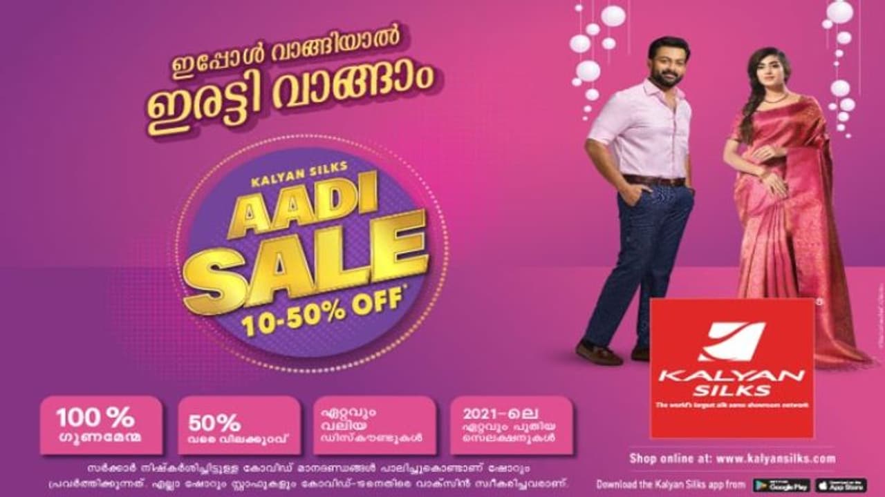 ആടിമാസ സെയില് മലയാളിക്ക് പരിചയപ്പെടുത്തിയ കല്യാണ് സില്ക്സ് വീണ്ടുമൊരു ആടി സെയിലിന് തുടക്കമിട്ടിരിക്കുന്നു. മഹാമാരിയുടെ പശ്ചാത്തലത്തിൽ സംസ്ഥാന സർക്കാർ പ്രഖ്യാപിച്ച ലോക്ക്ഡൗൺ കാരണം ജൂലൈയിൽ നടത്താ൯ കഴിയാതിരുന്ന ആടി സെയിലാണ് ഉപഭോക്താക്കളുടെ അഭ്യർത്ഥന മാനിച്ച് കൂടുതൽ കരുതലോടെ കല്യാൺ സിൽക്സ് ഇപ്പോൾ നടത്തുന്നത്. മഹാമാരി ലോകത്തെ മുഴുവന് പിടിച്ചുലച്ച സാഹചര്യത്തില് കല്യാണ് സില്ക്സ് ഇന്ത്യയിലെ പ്രമുഖ മില്ലുകളോട് മുന്പത്തെക്കാളും കുറഞ്ഞ വിലയില് വസ്ത്രശ്രേണികള് ലഭ്യമാക്കുവാന് അഭ്യര്ത്ഥിക്കുകയും, ആ അഭ്യര്ത്ഥന അവര് അനുഭാവപൂര്വ്വം പരിഗണിക്കുകയും ചെയ്തിരിക്കുന്നു. ഇത്തരമൊരു നീക്കത്തിലൂടെ ലഭിച്ച വലിയ വിലക്കിഴിവുകള് ഉപഭോക്താക്കള്ക്ക് കല്യാണ് സില്ക്സ് അതേപടി കൈമാറുകയാണ്. ഇതോടൊപ്പം കല്യാണ് സില്ക്സിന്റ സ്വന്തം നെയ്ത്ത്ശാലകളില് നിന്നും പ്രൊഡക്ഷന് ഹൗസുകളില് നിന്നുമുള്ള ആടി കളക്ഷനുകള് ലാഭേച്ച കൂടാതെയാണ് ഉപഭോക്താക്കള്ക്ക് കൈമാറുന്നത്. ഈ വര്ഷത്തെ ഏറ്റവും പുതിയ കളക്ഷനുകള് 10 മുതല് 50% വരെ വിലക്കുറവിലാണ് ഈ സെയിലിലൂടെ ലഭ്യമാക്കുന്നത്.