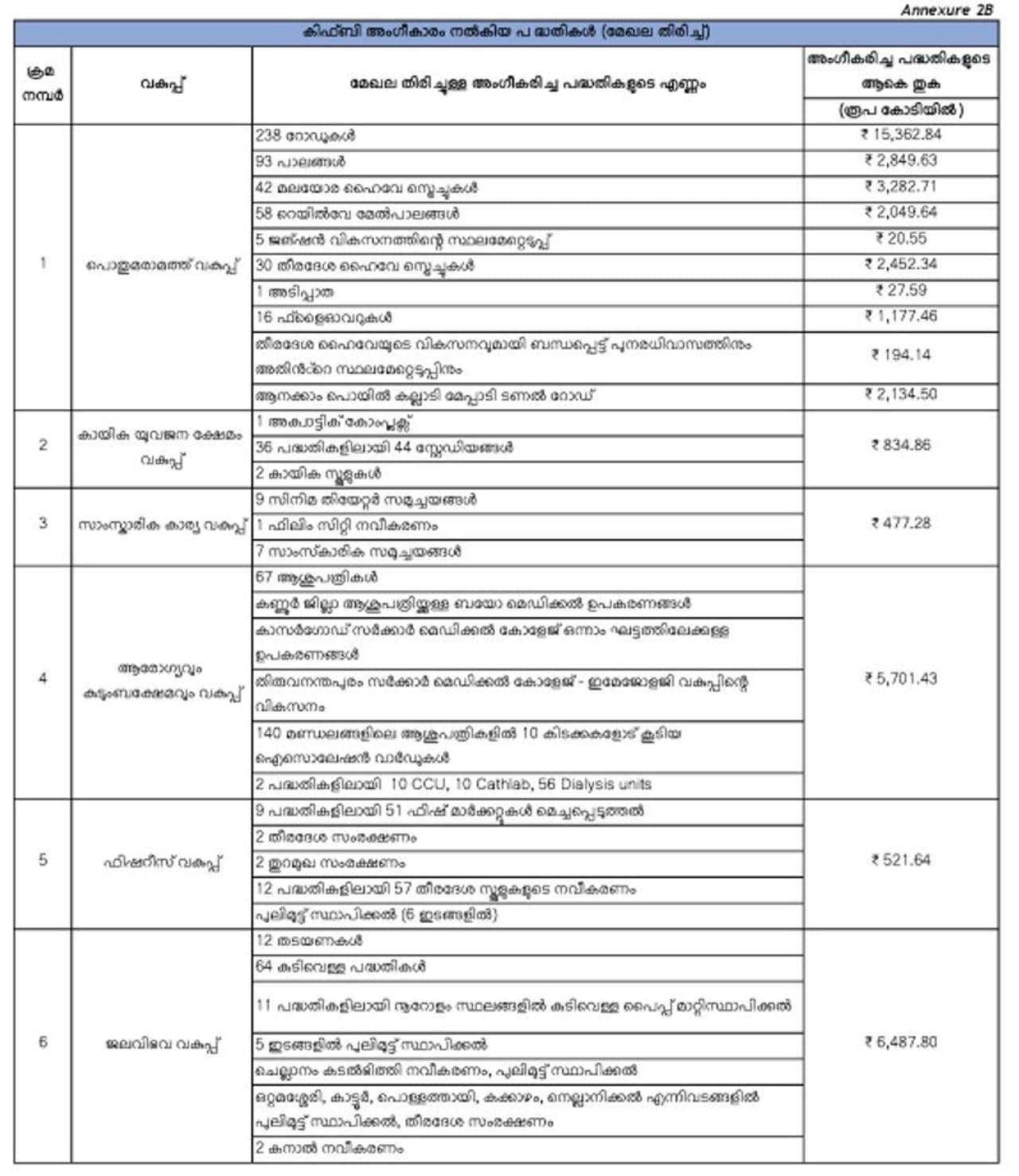 പൊതുവിദ്യഭ്യാസ വകുപ്പിന് കീഴില് 143 പദ്ധതികള്ക്കും, ജലവിഭവവകുപ്പിന് കീഴില് 96 പദ്ധതികള്ക്കും , ആരോഗ്യ-കുടുംബക്ഷേമ വകുപ്പിന് കീഴില് 73 പദ്ധതികള്ക്കും, ഉന്നതവിദ്യാഭ്യാസ വകുപ്പിന് കീഴില് 61 പദ്ധതികള്ക്കും കായിക യുവജനക്ഷേമവകുപ്പിന് കീഴില് 39 പദ്ധതികള്ക്കും, മത്സ്യബന്ധന വകുപ്പിന് കീഴില് 26 പദ്ധതികള്ക്കും അനുമതി നല്കിയിട്ടുണ്ട്.