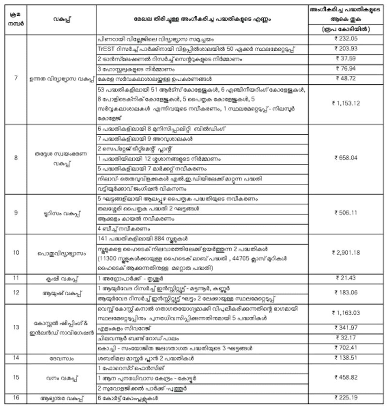 - പൊതുവിദ്യാഭ്യാസ വകുപ്പ്: 269 സ്കൂള് കെട്ടിടങ്ങള്, 44705 ഹൈടെക് ക്ലാസ് റൂമുകള്, 112577 ഹൈടെക് ലാബുകള് (89 പദ്ധതികളിലായി) - തുക: 1780.55 കോടി
