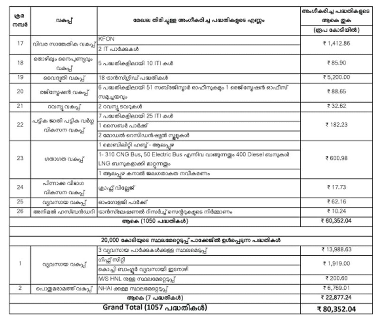 - ആരോഗ്യ കുടുംബക്ഷേമ വകുപ്പ്: ജിഎംസി തിരുവനന്തപുരം, 1 താലൂക്ക് ആശുപത്രി, 1 ജനറല് ഹോസ്പിറ്റല്, 43 ഡയാലിസിസ് സെന്ററുകള്, 7 സി.സി.യു, 8 കാത്ലാബുകള് - തുക: 334.02 കോടി