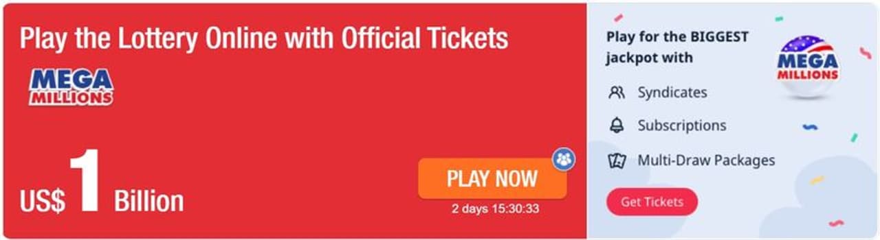 ഈ വെള്ളിയാഴ്ച്ച യുണൈറ്റഡ് സ്റ്റേറ്റ്സ് മെഗാ മില്യൺസ് ലോട്ടറി വാഗ്ദാനം ചെയ്യുന്നത് 1 ബില്യൺ യു.എസ് ഡോളർ ആണ്. ലോകത്തിലെ സമാനമായ വലിയ പ്രൈസ് മണികൾക്ക് വളരെ അരികിലാണ് ഈ തുക. ലോട്ടോസ്മൈലിൽ ലളിതമായ മൂന്ന് സ്റ്റെപ്പുകളിലൂടെ ടിക്കറ്റ് വാങ്ങി നിങ്ങൾക്കും ഒരു ബില്യണയറാകാനുള്ള വഴിതുറക്കാം.
