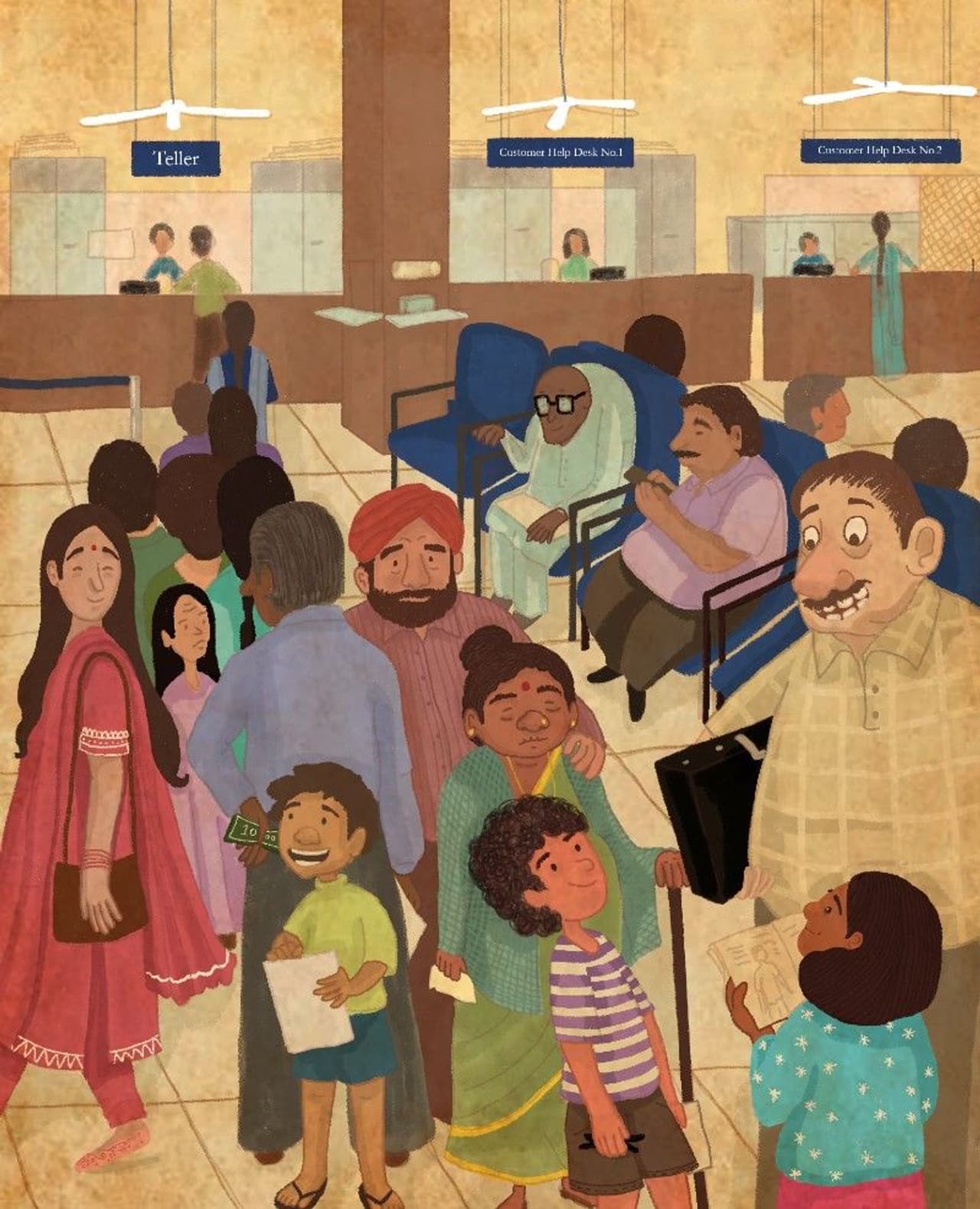രാഹുലും അനന്യയും കബീറും ബാങ്കില്. പുസ്തകത്തില്നിന്നൊരു രേഖാചിത്രം. Illustration: Ambika Karandikar