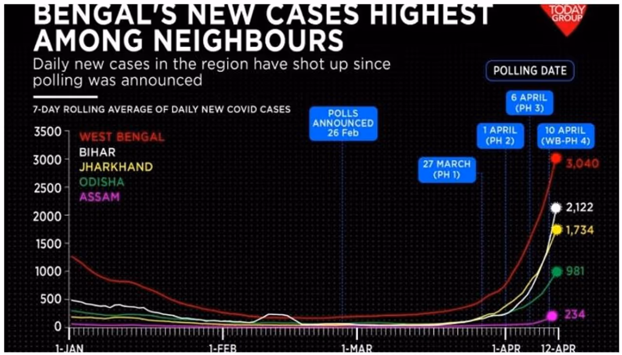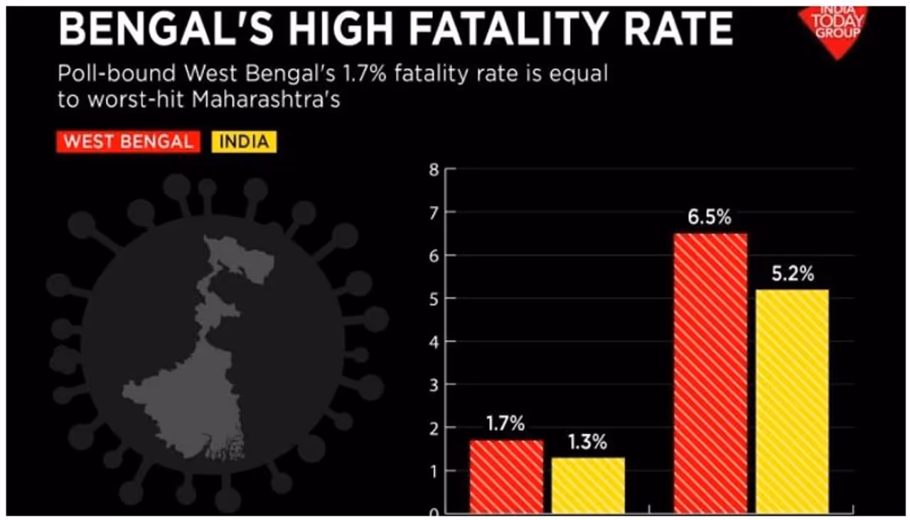 ബംഗാളിലെ ടെസ്റ്റ് പോസിറ്റിവിറ്റി റേറ്റ്, ഇന്ത്യയിലെ തന്നെ ഏഴാം സ്ഥാനത്തേക്ക് കുതിച്ചുയർന്നിട്ടുണ്ട്. അഖിലേന്ത്യാ ശരാശരി 5.2 ശതമാനമാണെന്നിരിക്കെ ബംഗാളിലെ പോസിറ്റിവിറ്റി റേറ്റ് 6.5 ശതമാനമാണ്. അയൽ സംസ്ഥനങ്ങളായ ബീഹാർ, ഝാർഖണ്ഡ്, ഒഡീഷ എന്നിവയോട് താരതമ്യപ്പെടുത്തുമ്പോൾ കഴിഞ്ഞമാസം പുതിയ കൊവിഡ് രോഗികളുടെ എണ്ണം അസാമാന്യമാം വിധത്തിൽ കുതിച്ചുയർന്ന കാഴ്ചയാണ് ബംഗാളിൽ കാണാൻ സാധിക്കുന്നത്. ഏപ്രിൽ 12 വരെയുള്ള ഏഴ് ദിവസത്തെ ശരാശരി കണക്കെടുത്താൽ ബംഗാളിൽ ഒരുദിവസം 3040 കേസുകളാണ് രജിസ്റ്റർ ചെയ്യുന്നത്. ബീഹാർ 2122, ഝാർഖണ്ഡ് 1734, ഒഡീഷ 981, അസം 234 എന്നിവയാണ് മറ്റ് കണക്കുകൾ. ഇവയേക്കാൾ വളരെ മുന്നിലാണ് ബംഗാളിലെ കണക്കുകൾ.