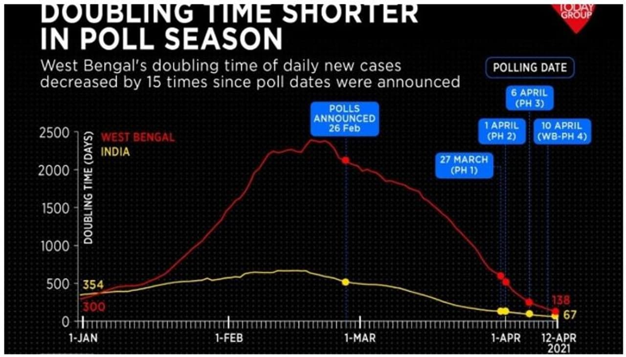 ബംഗാളിലെ കോവിഡ് കേസുകളുടെ എണ്ണം മറ്റ് പല സംസ്ഥാനങ്ങളെ അപേക്ഷിച്ച് കുറവാണ്. എന്നാൽ പുതിയ അണുബാധകളുടെ ദ്രുതഗതിയിലുള്ള വര്ധന സംസ്ഥാനത്ത് ആശങ്ക ഉണ്ടാക്കുന്നുണ്ട്. ഫെബ്രുവരി 26 ന് തിരഞ്ഞെടുപ്പ് തീയതികള് പ്രഖ്യാപിച്ചതിന് ശേഷം കോവിഡ് കേസുകള് ഇരട്ടിയായ സാഹചര്യമാണുള്ളത്. ഏപ്രില് 17, 22, 26, 29 തീയതികളിലാണ് ബംഗാള് തിരഞ്ഞെടുപ്പിന്റെ ബാക്കി ഘട്ടങ്ങള്.