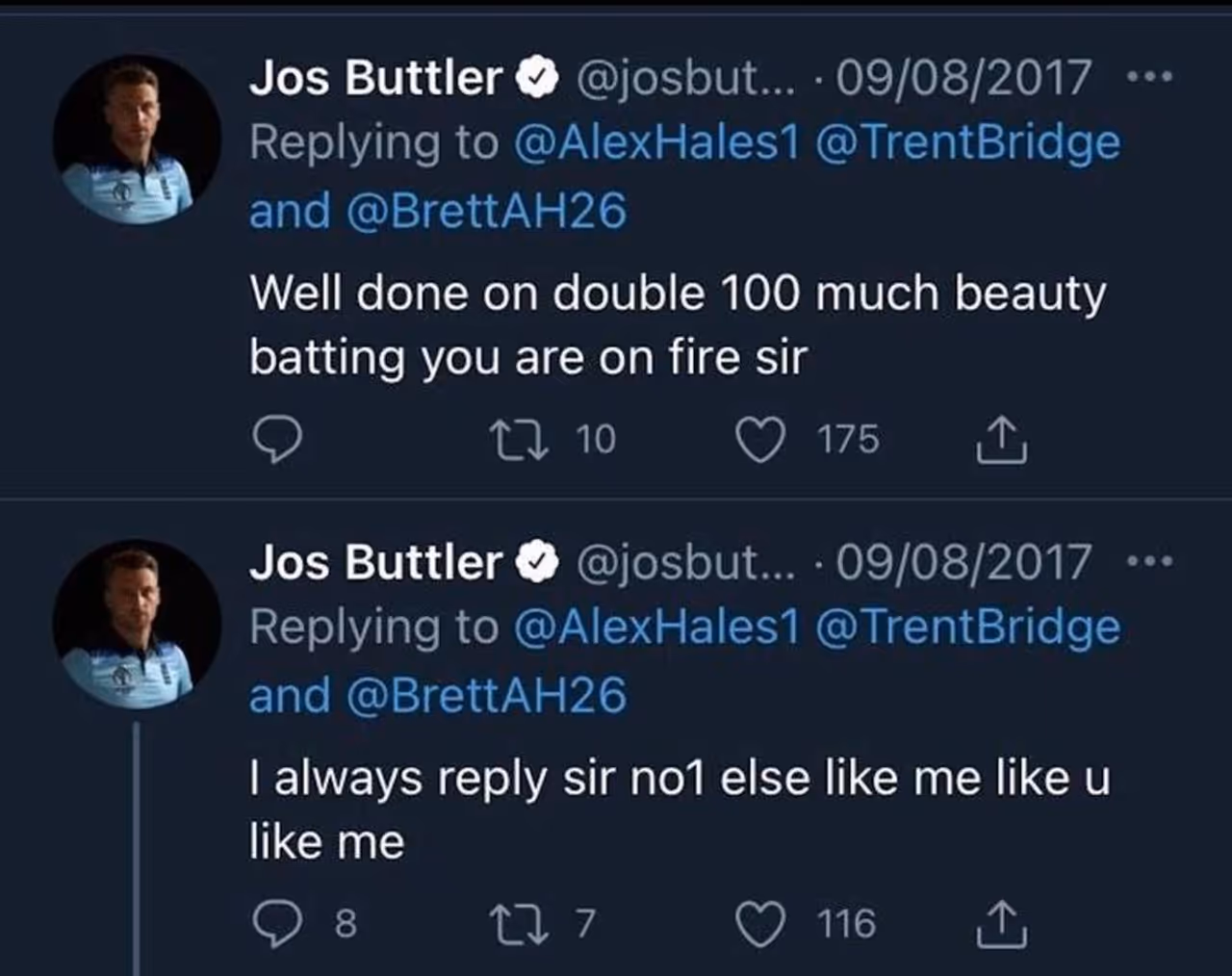 2018ൽ ഐപിഎല്ലിൽ രാജസ്ഥാൻ റോയൽസിനായി കളിക്കുമ്പോൾ സെഞ്ചുറി നേടിയ ബട്ലറെ അഭിനന്ദിക്കാനായി മോർഗൻ നടത്തിയ ട്വീറ്റും ഇതിന് ബട്ലർ നൽകിയ മറുപടിയുമാണ് ഇന്ത്യൻ താരങ്ങളുടെ ഇംഗ്ലീഷ് ഗ്രാമറിനെപരിഹസിക്കുന്നതാണെന്ന ആരോപണത്തിന് കാരണമായത്.