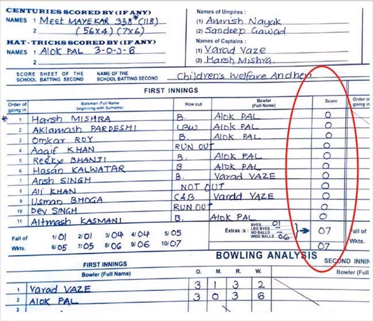 762 റണ്സ് വിജയലക്ഷ്യവുമായി മറുപടി ബാറ്റിങ്ങിനിറങ്ങിയ ചില്ഡ്രന്സ് വെല്ഫെയര് സ്കൂള് പുറത്തായത് വെറും ഏഴ് റണ്സിന്. ആറോവറില് മത്സരം അവസാനിച്ചു. ടീമിലെ ബാറ്റ്സ്മാന്മാര് എല്ലാവരും പൂജ്യത്തിന് പുറത്താവുകയായിരുനനു. ലഭിച്ച ഏഴ് റണ്സാവട്ടെ എതിര് ടീം ബൗളിങ്ങിന്റെ ദാനമായിരുന്നു. മൂന്നോവറില് വെറും 3 റണ്സ് വിട്ടുകൊടുത്ത് ആറ് വിക്കറ്റുകള് സ്വന്തമാക്കിയ അലോക് പാലാണ് ചില്ഡ്രന്സ് സ്കൂളിനെ എറിഞ്ഞിട്ടത്.