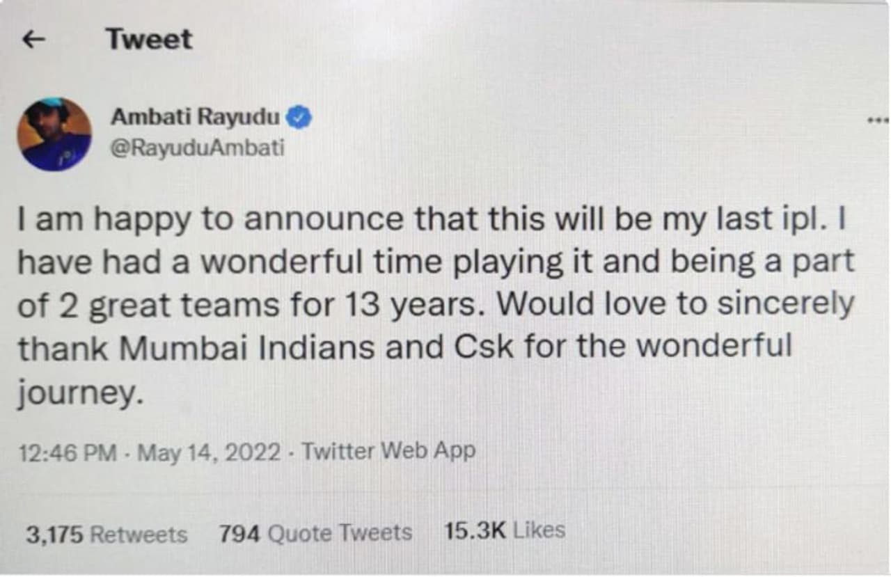 'ഇത് എന്റെ അവസാന ഐപിഎല് ആയിരിക്കുമെന്ന് അറിയിക്കുകയാണ്. 13 വര്ഷക്കാലമായി രണ്ട് മഹത്തായ ടീമുകളുടെ ഭാഗമായി. മുംബൈ ഇന്ത്യന്സിനും ചെന്നൈ സൂപ്പര് കിംഗ്സിനും നന്ദി' എന്നായിരുന്നു വിരമിക്കല് അറിയിച്ചുകൊണ്ട് അമ്പാട്ടി റായുഡുവിന്റെ ട്വീറ്റ്.