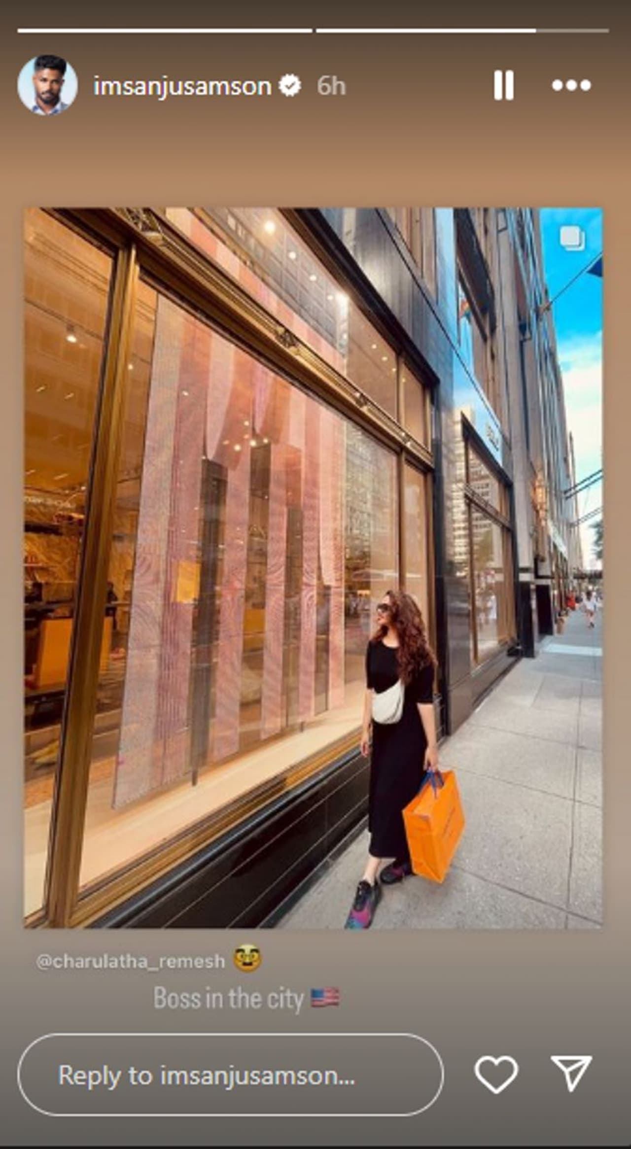 ഇതിനിടെ സഞ്ജുവിന്റെ പുതിയ ഇന്സ്റ്റഗ്രാം പോസ്റ്റാണ് ആരാധകര് ഇപ്പോള് ഏറ്റെടുത്തിരിക്കുന്നത്. സഞ്ജുവിന്റെ ഭാര്യ ചാരുലത അമേരിക്കയിലെത്തിയ ചിത്രം പങ്കുവെച്ച് സഞ്ജു കുറിച്ചത് ബോസ് നഗരത്തിലെത്തിയെന്നായിരുന്നു.ഐപിഎല്ലിനുശേഷം ടി20 ലോകകപ്പിനുള്ള ഇന്ത്യന് സംഘത്തിനൊപ്പം യാത്ര തിരിക്കാതിരുന്ന സഞ്ജു വ്യക്തിപരമായ ആവശ്യങ്ങള്ക്കായി ബിസിസിഐ അനുമതിയോടെ ദുബായിലേക്ക് പോയിരുന്നു. അവിടെ നിന്ന് ഒറ്റക്കാണ് സഞ്ജു അമേരിക്കയിലെത്തിയത്. ആ സമയത്ത ഭാര്യയെ സഞ്ജു കൂടെ കൂട്ടിയിരുന്നില്ല. 2018ലാണ് സുഹൃത്തായ ചാരുലതയെ സഞ്ജു വിവാഹം കഴിച്ചത്.