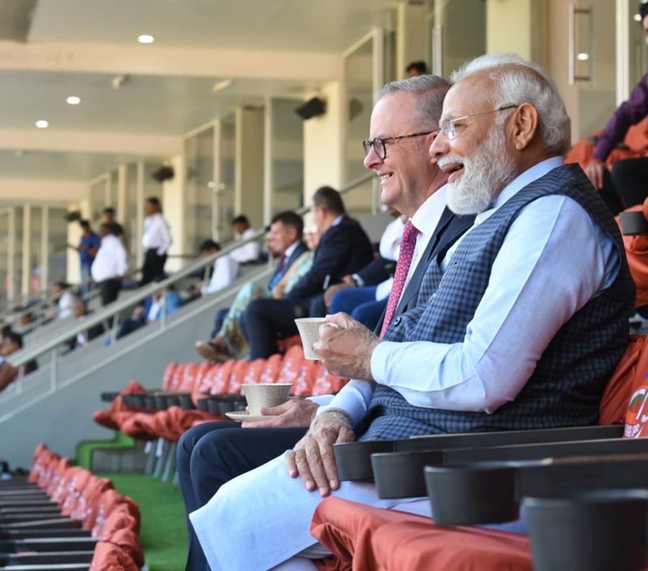 പിന്നീട് സ്റ്റേഡിയത്തിലെ പ്രത്യേക പവലിയന് ഇരുവരും സന്ദര്ശിച്ചു. മുന് ഇന്ത്യന് താരവും കമന്റേറ്ററുമായ രവി ശാസ്ത്രി ഇരുവര്ക്കും പവലിയനിലെ ഇന്ത്യ-ഓസ്ട്രേലിയ പോരാട്ടങ്ങളുടെ ഓര്മകളും ചിത്രങ്ങളും വിശദീകരിച്ചുകൊടുത്തു. ഇതിനുശേഷം ഇരു ടീമിലെയും താരങ്ങളെ ഗ്രൗണ്ടില് പരിചയപ്പെട്ട ഇരുപ്രധാനമന്ത്രിമാരും കളിക്കാര്ക്കൊപ്പം നിന്ന് ദേശീയ ഗാനവും പാടിയാണ് വിഐപി ഗ്യാലറിയിലെത്തി മത്സരം കാണാനിരുന്നത്.