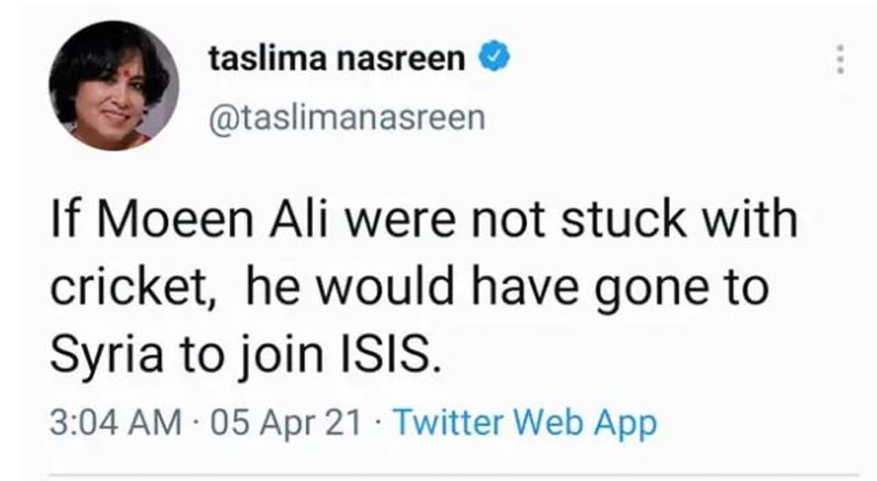 മുംബൈ: ഇംഗ്ലണ്ട് ക്രിക്കറ്റ് താരം മൊയീൻ അലിക്കെതിരെ പ്രശസ്ത എഴുത്തുകാരി തസ്ലീമ നസ്റീൻ നടത്തിയ ട്വീറ്റിനെച്ചൊല്ലി പ്രതിഷേധം പുകയുന്നു. ക്രിക്കറ്റ് താരമായിരുന്നില്ലെങ്കിൽ മൊയീൻ അലി സിറിയയിൽ പോയി ഐഎസിൽ ചേരുമായിരുന്നു എന്ന തസ്ലീമ നസ്റീന്റെ ട്വീറ്റാണ് വൻ വിവാദത്തിന് തിരി കൊളുത്തിയത്.