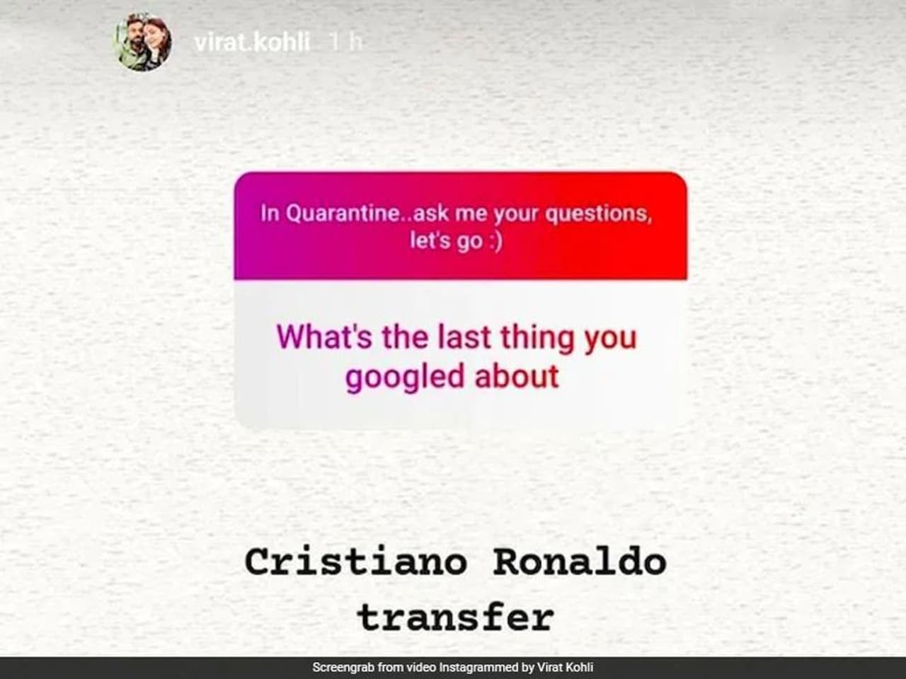 കോലി അവസാനമായി എന്താണ് ഗൂഗിളിൽ തിരഞ്ഞത് എന്നായിരുന്നു ഒരു ആരാധകന് അറിയേണ്ടിയിരുന്നത്. യുവന്റസ് സൂപ്പർ താരം ക്രിസ്റ്റ്യാനോ റൊണാൾഡോയുടെ ട്രാൻസ്ഫറിനെക്കുറിച്ചാണ് ഗൂഗിളിൽ സെർച്ച് ചെയ്തത് എന്നായിരുന്നു കോലിയുടെ മറുപടി. റൊണാൾഡോയുടെ കടുത്ത ആരാധകനാണ് കോലി. ഇറ്റാലിയാൻ ലീഗിലും ചാമ്പ്യൻസ് ലീഗിലും കിരീടം കൈവിട്ട യുവന്റസിൽ നിന്ന് റൊണാൾഡോ റയലിൽ തിരിച്ചെത്തിയേക്കുമെന്ന് നേരത്തെ റിപ്പോർട്ടുകളുണ്ടായിരുന്നു. യുവന്റസിൽ റൊണാൾഡോ അസംതൃപ്തനാണെന്നും സൂചനയുണ്ടായിരുന്നു.