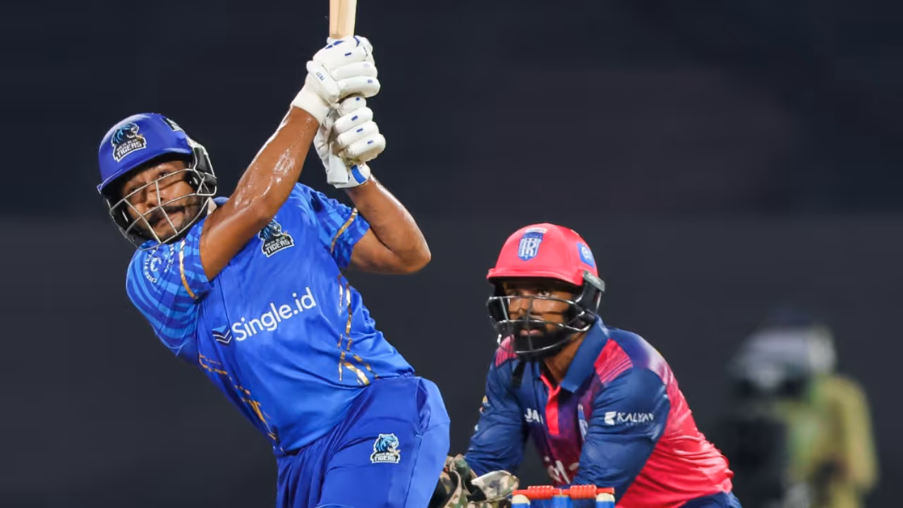 വിജയലക്ഷ്യത്തിലേക്ക് ബാറ്റിംഗ് ആരംഭിച്ച ബ്ലൂ ടൈഗേഴ്സിന് 28 റണ്സിനിടെ ഓപ്പണര്മാരായ ജോബിന് ജോബി (8), വിനൂപ് മനോഹരന് (14) എന്നിവരുടെ വിക്കറ്റുകള് നഷ്ടമായി. എങ്കിലും സാലി - മുഹമ്മദ് ഷാനും (20 പന്തില് 23) ടീമിനെ വിജയത്തിലേക്ക് നയിച്ചു. ഇരുവരും ചേര്ന്നുള്ള സഖ്യം 71 റണ്സാണ് കൂട്ടിചേര്ത്തത്. മൂന്ന് സിക്സും അഞ്ച് ഫോറും ഉള്പ്പെടുന്നതായിരുന്നു സാലിയുടെ ഇന്നിംഗ്സ്. സഞ്ജുവിന്റെ ബാറ്റിംഗ് കാണാന് ആരാധകര് സ്റ്റേഡിയത്തിലെത്തിയതെങ്കിലും സഹോദരന് സാലിയുടെ ബാറ്റിംഗ് കണ്ട് മടങ്ങേണ്ടി വന്നു.