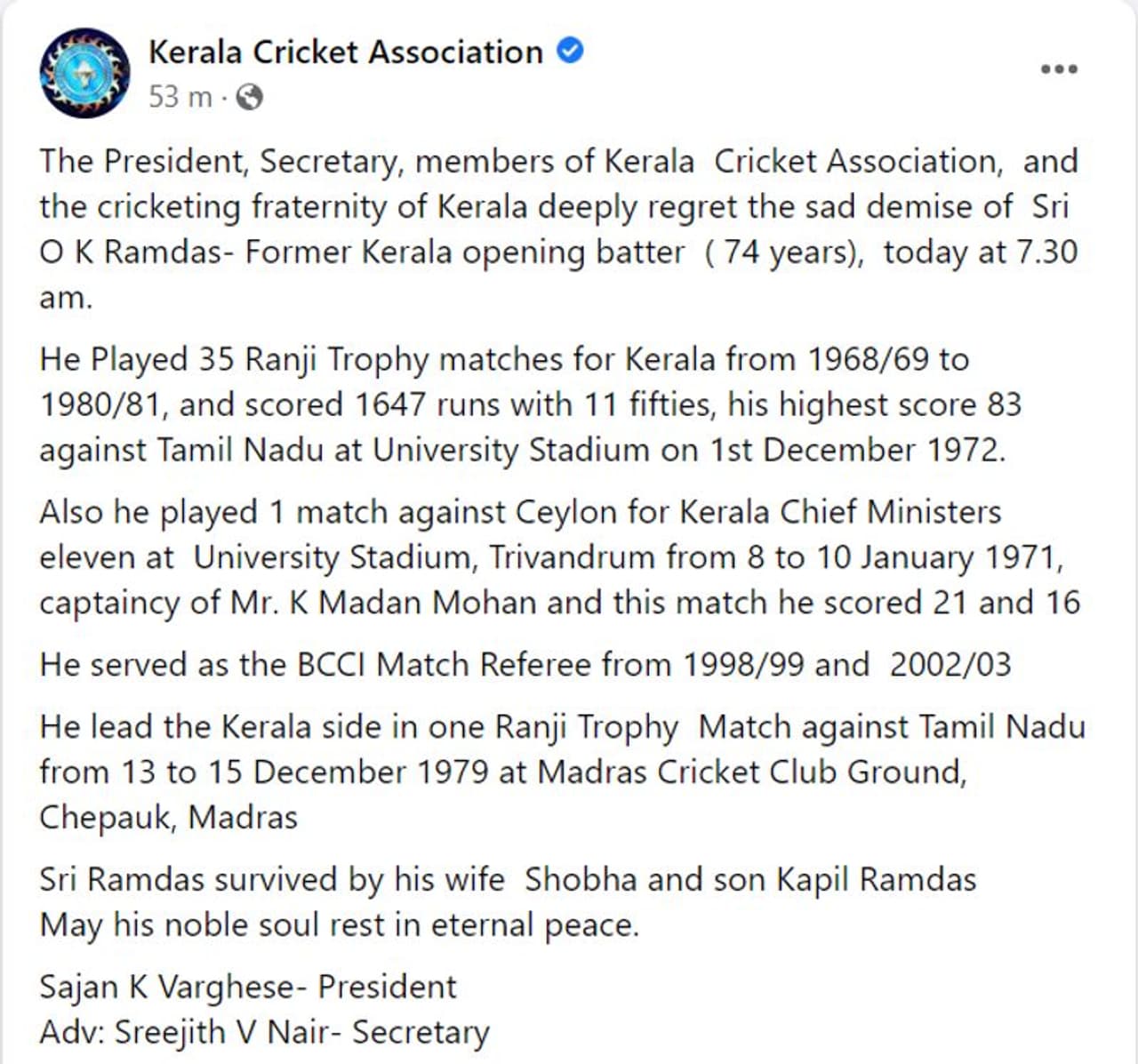 തിരുവനന്തപുരം: കേരള ക്രിക്കറ്റ് ടീം(Kerala Cricket Team) മുന് നായകനും ഓപ്പണിംഗ് ബാറ്ററുമായ ഒ.കെ രാംദാസ്(O K Ramdas) അന്തരിച്ചു. 74 വയസായിരുന്നു. തിരുവനന്തപുരത്ത് ചികില്സയിലിരിക്കേയാണ് അന്ത്യം. ഭാര്യ ശോഭ. മകന് കപില് രാംദാസ്. ഒ.കെ രാംദാസിന്റെ വിയോഗത്തില് കേരള ക്രിക്കറ്റ് അസോസിയേഷന് അനുശോചിച്ചു.