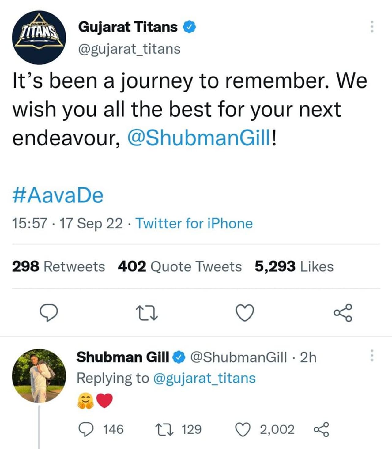 ടൈറ്റന്സ് ട്വീറ്റില് പറഞ്ഞതിങ്ങനെയായിരുന്നു.. ''ഒരുപാട് ഓര്ക്കാനുള്ള യാത്രയായിരുന്നത്. അടുത്ത ഉദ്യമത്തിന് എല്ലാവിധ ആശംസകളും.'' ടൈറ്റന്സ് കുറിച്ചിട്ടു. ഇതിന് ഗില് മറുപടിയും നല്കിയിട്ടുണ്ട്. ഹൃദയത്തിന്റെ ഇമോജിയിട്ടാണ് ഗില് പ്രതികരിച്ചത്. ട്വീറ്റ് വായിക്കാം...