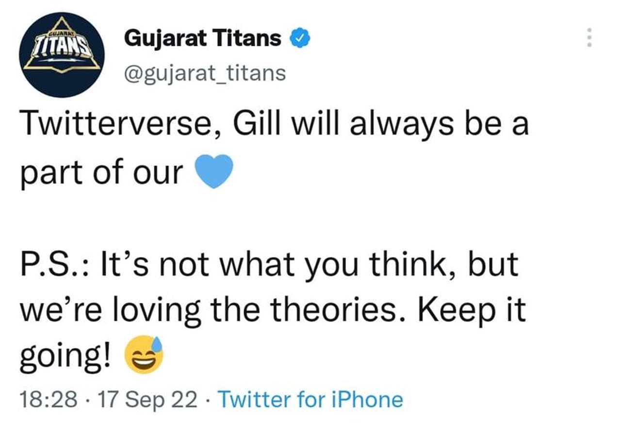 എന്നാലിപ്പോള് മറ്റൊരു ട്വീറ്റുമായി എത്തിയിരിക്കുകയാണ് ടൈറ്റന്സ്. അതിങ്ങനെയായിരുന്നു... ''ഗില് എപ്പോഴും ഞങ്ങളുടെ ഭാഗമായിരിക്കും. നിങ്ങള് ചിന്തിക്കുന്ന അര്ത്ഥമല്ല ട്വീറ്റിനുള്ളത്. എന്നാല് നിങ്ങളുടെ തിയറി ഞങ്ങള്ക്ക് ഏറെ ബോധിച്ചു. അതങ്ങനെ മുന്നോട്ട് പോവട്ടെ.'' ടൈറ്റന്സ് വ്യക്തമാക്കി.