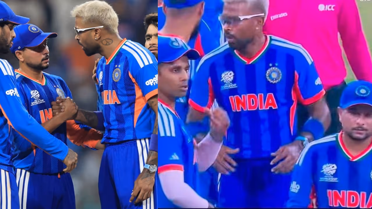 കൊളംബോ: ടി20 ലോകകപ്പില്‍ പാകിസ്ഥാനെതിരെ 61 റൺസിന്‍റെ ഉജ്ജ്വല വിജയം സ്വന്തമാക്കി ഇന്ത്യ സൂപ്പർ-8ൽ എത്തിയെങ്കിലും, മത്സരശേഷം സഹതാരം കുല്‍ദീപ് യാദവിനോട് രൂക്ഷമായി പ്രതികരിച്ച് ഇന്ത്യൻ ഓള്‍ റൗണ്ടര്‍ ഹാര്‍ദ്ദിക് പാണ്ഡ്യയും ക്യാപ്റ്റൻ സൂര്യകുമാര്‍ യാദവും. പാക് ഇന്നിംഗ്‌സിന്‍റെ അവസാന ഓവറുകളിൽ ഷഹീന്‍ ഷാ അഫ്രീദി നല്‍കിയ അനായാസ ക്യാച്ച് കൈവിട്ട കുല്‍ദീപ് സിക്സ് വഴങ്ങിയിരുന്നു. ഇതാണ് ഹാര്‍ദ്ദിക്കിനെയും പാണ്ഡ്യയെയും ചൊടിപ്പിച്ചത്.