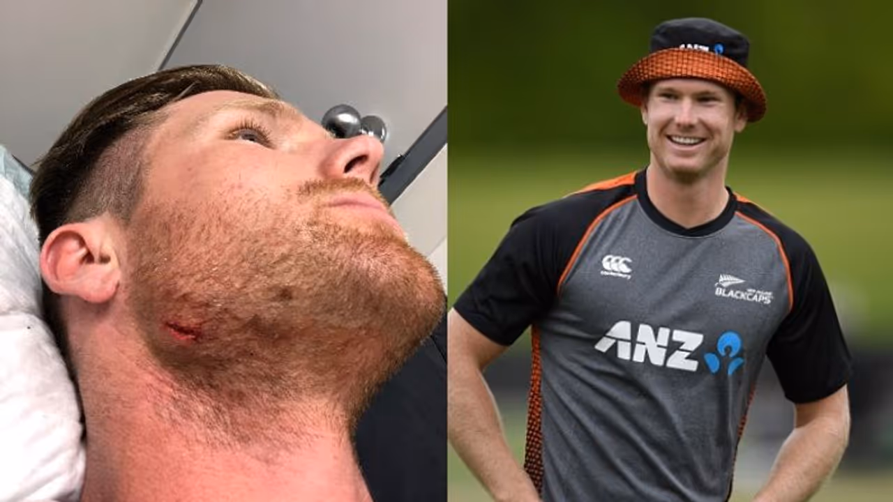 റിവേഴ്സ് സ്വീപ്പ് പാളി, ന്യൂസിലന്ഡ് താരത്തിന്റെ താടിക്ക് മുറിവ്, പിന്നാലെ രസകരമായ ട്വീറ്റ്.