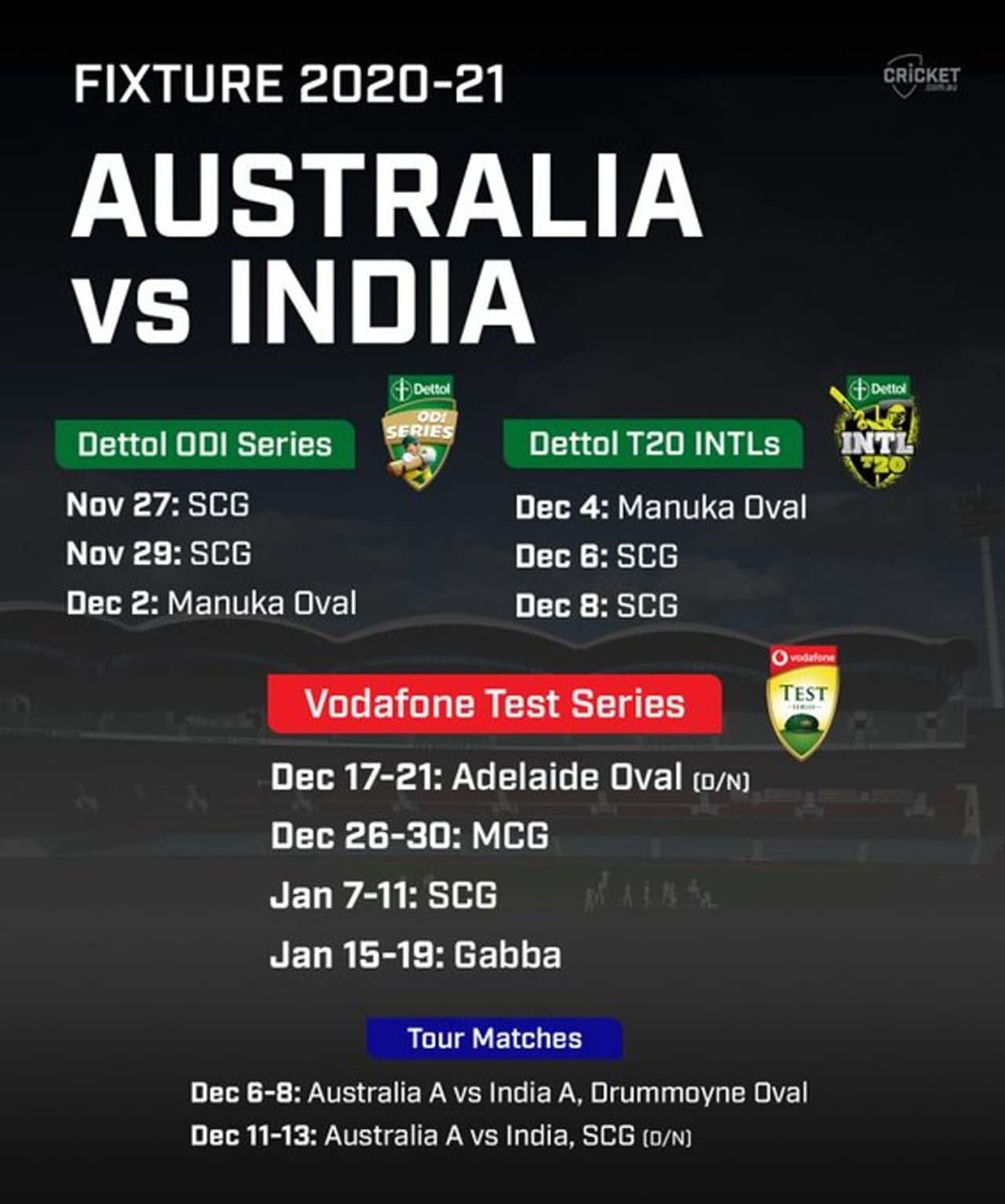 നവംബര് 27ന് സിഡ്നിയിലാണ് ആദ്യ ഏകദിനം. രണ്ടാം മത്സരം 29ന് സിഡ്നിയിലും മൂന്നാം ഏകദിനം ഡിസംബര് 2ന് കാന്ബറയിലും നടക്കും. കാന്ബറയില് ഡിസംബര് ആറിനാണ് ആദ്യ ടി20. രണ്ടും മൂന്നും ടി20ക്ക് യഥാക്രമം നാല്, എട്ട് തീയതികളില് സിഡ്നി വേദിയാവും. അഡ്ലെയ്ഡില് 17-ാം തീയതി പകല്-രാത്രി മത്സരത്തോടെയാണ് ടെസ്റ്റ് പരമ്പരക്ക് തുടക്കമാവുക. ഡിസംബര് 26 മുതല് 30 വരെ മെല്ബണിലാണ് ബോക്സിംഗ് ഡേ ടെസ്റ്റ്. മൂന്നാം ടെസ്റ്റ് ജനുവരി ഏഴ് മുതല് സിഡ്നിയിലും അവസാന ടെസ്റ്റ് 15 മുതല് ബ്രിസ്ബേനിലും നടക്കും.