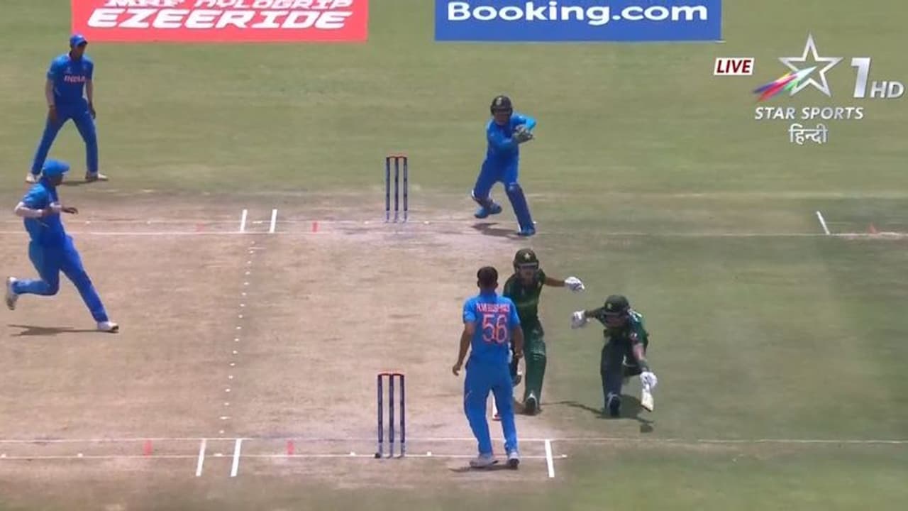 രവി ബിഷ്ണോയി എറിഞ്ഞ മത്സരത്തിന്റെ 31-ാം ഓവറിലായിരുന്നു നാടകീയ റണ്ണൗട്ട്. ബിഷ്ണോയിയുടെ പന്ത് ഓഫ് സൈഡിലേക്ക് തട്ടിയിട്ട് സിംഗിളിന് ശ്രമിച്ച ക്വാസിം അക്രം റണ്ണിനായി ക്രീസ് വിട്ടിറങ്ങി.