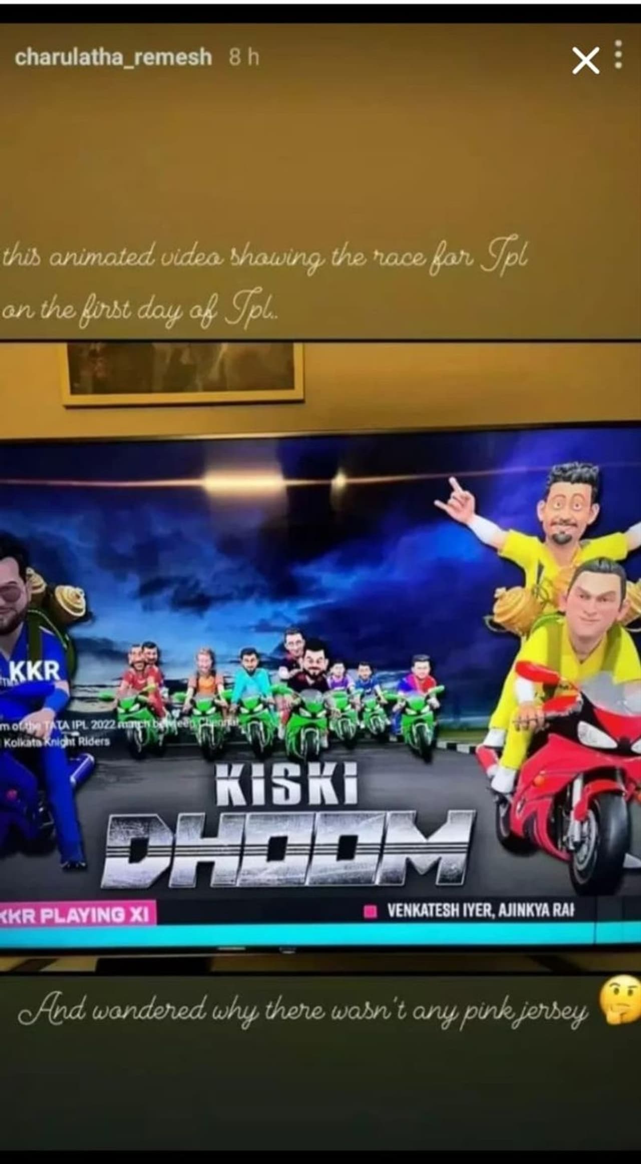 എന്നാല് രാജസ്ഥാന്റെ പിങ്ക് ജേഴ്സിയോ നായകനായ സഞ്ജു സാംസണോ ബൈക്കോടിക്കുന്നത് മാത്രം ചിത്രത്തിലില്ല. ഇതു തന്നെയാണ് ചാരുലതയെ അത്ഭുതപ്പെടുത്തിയതും. ഇതില് പിങ്ക് ജേഴ്സി ഇല്ലാത്തത് തന്നെ അത്ഭുതപ്പെടുത്തിയെന്നായിരുന്നു ചാരുലതയുടെ പോസ്റ്റ്. പരസ്യത്തില് വമ്പന് ടീമുകള്ക്ക് പ്രാധാന്യം നല്കി ചെറിയ ടീമുകളെ തഴഞ്ഞ സ്റ്റാര് സ്പോര്ട്സിന്റെ നിലപാടാണ് ചാരുലത ചോദ്യം ചെയ്തത്.