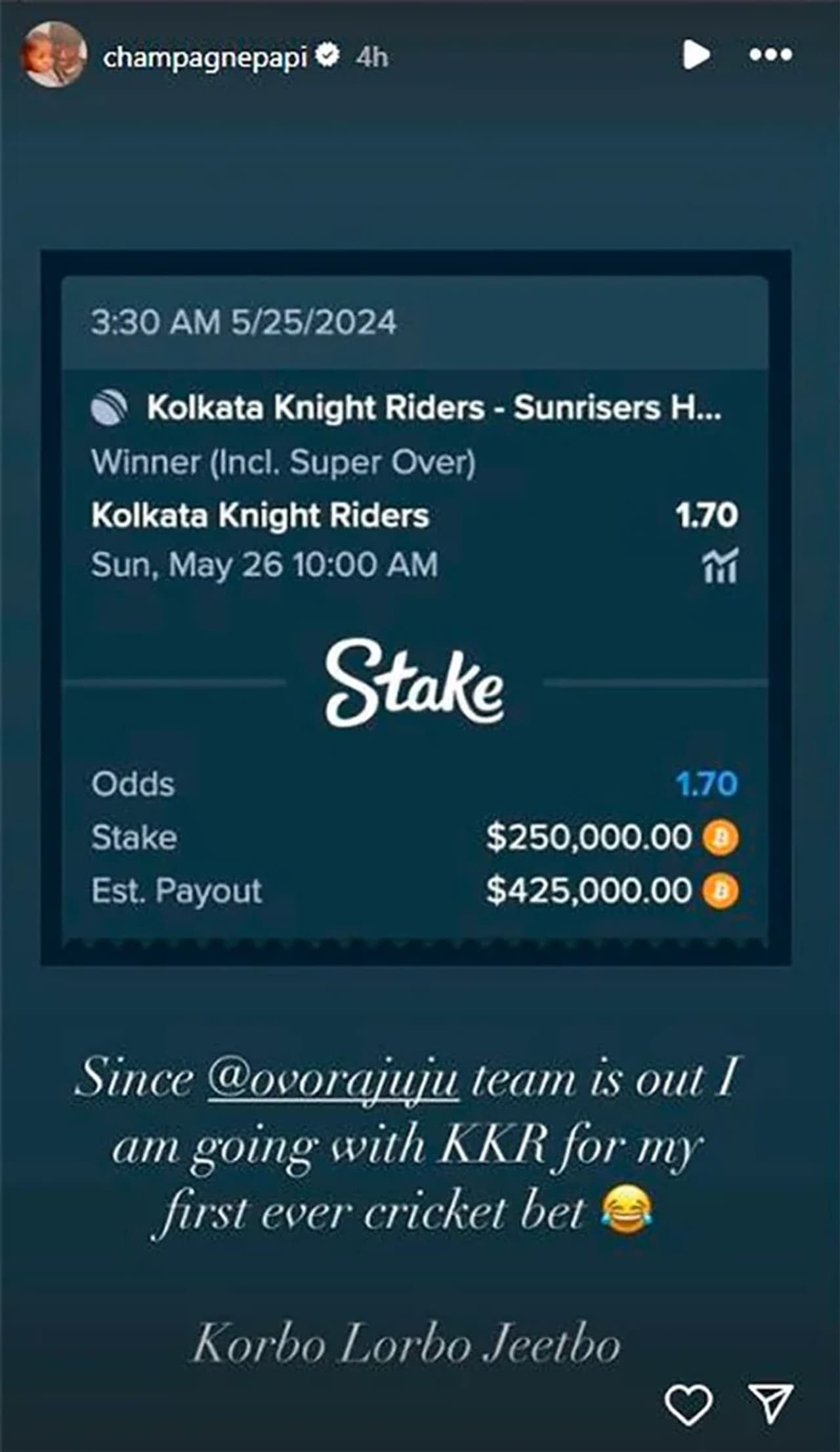 ഓണ്ലൈന് ക്രിപ്റ്റോ കറന്സി കാസിനോ ആയ സ്റ്റേക്ക്.കോമിലാണ് ഡ്രേക്ക് ബെറ്റ് വെച്ചിരിക്കുന്നത്. ബെറ്റില് ജയിച്ചാല് ഡ്രേക്കിന് ഏകദേശം 4.25 ലക്ഷം യുഎസ് ഡോളര് ലഭിക്കും. മുമ്പ് ബാസ്കറ്റ് ബോള്, ഫുട്ബോള്, റഗ്ബി മത്സരങ്ങളില് ഇത്തരത്തില് ബെറ്റ് വെച്ചിട്ടുണ്ടെങ്കിലും ഇതാദ്യമായാണ് ക്രിക്കറ്റിൽ ബെറ്റുവെക്കുന്നതെന്ന് ഡ്രേക്ക് പറഞ്ഞു.