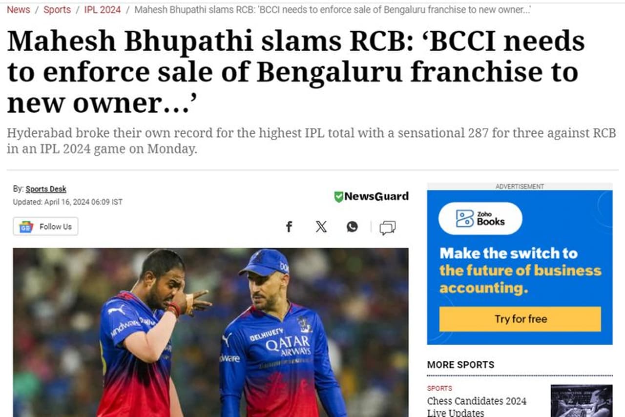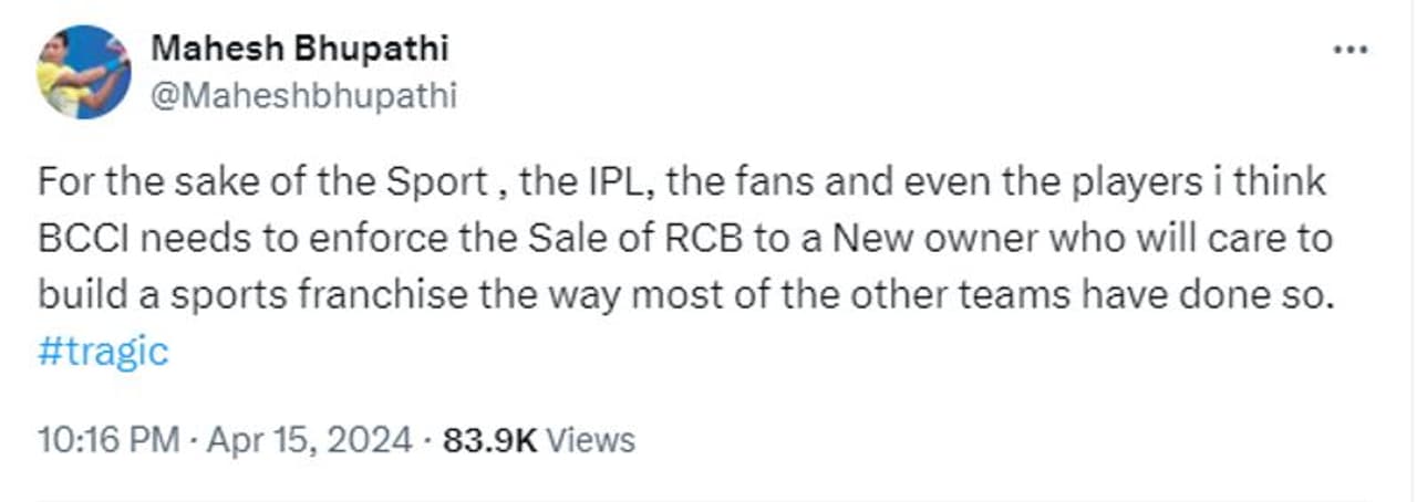 തുടര് തോല്വികളില് ആര്സിബിക്കെതിരെ അതിരൂക്ഷമായ വിമര്ശനമാണ് മഹേഷ് ഭൂപതിയുടെ ഭാഗത്ത് നിന്നുണ്ടായത്