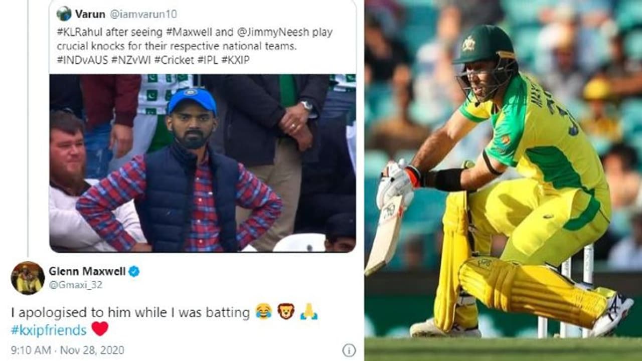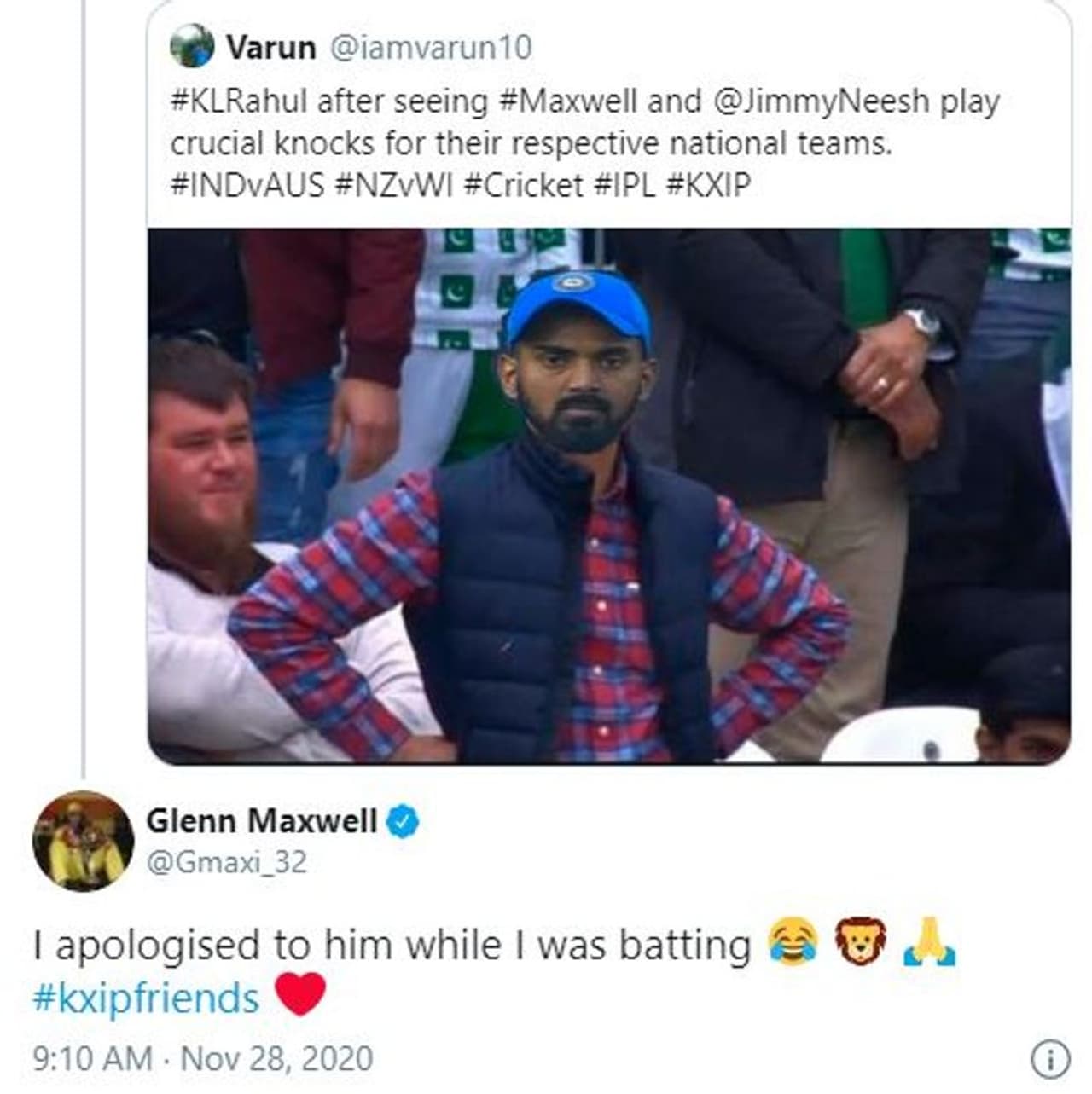 രാഹുലിന്റെ തലയുടെ ചിത്രം വെട്ടിയെടുത്ത് മറ്റൊരു ചിത്രത്തില് ഒട്ടിച്ചായിരുന്നു ട്രോള് പുറത്തിറക്കിയത്. രസകരമായ ട്രോള് എന്നാണ് റീട്വീറ്റില് നീഷാം കുറിച്ചിട്ടത്. എന്നാല് മാക്സ്വെല് നല്കിയ മറുപടിയായിരുന്നു രസകരം. ''ബാറ്റ് ചെയ്യുന്നതിനിടെ ഞാന് രാഹുലിനോട് ക്ഷമാപണം നടത്തിയിരുന്നു.'' മാക്സ്വെല് കമന്റ് ചെയ്തു. എന്തായാലും രണ്ട് പഞ്ചാബ് താരങ്ങളുടെ കൂടിച്ചേരല് ക്രിക്കറ്റ് ആരാധകരിലും ചിരി പടര്ത്തി.