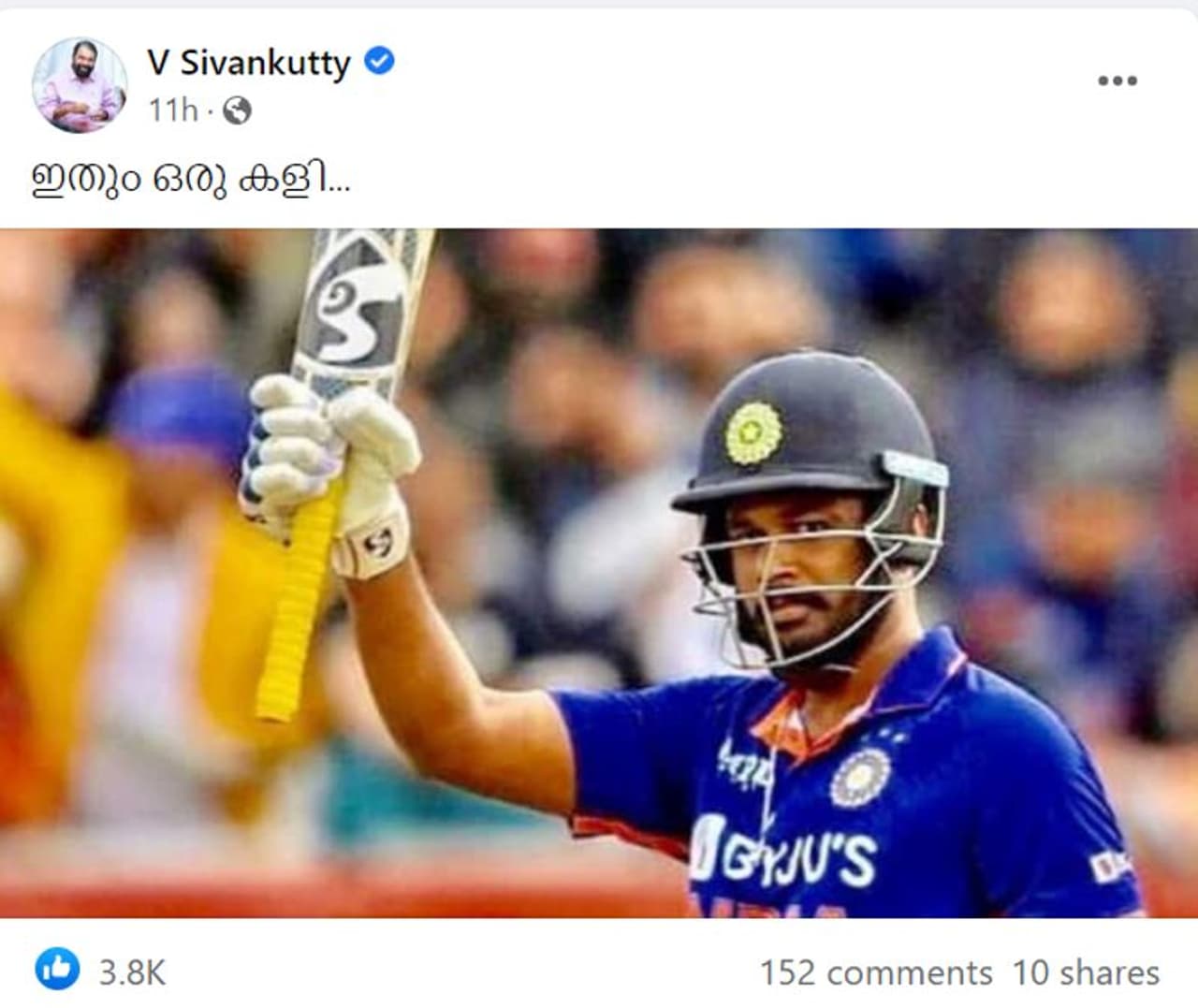 'ഇംഗ്ലണ്ടിനെതിരായ ഒന്നാം ട്വന്റി20 മത്സരത്തിനുള്ള ടീമിൽ മാത്രം മലയാളി ക്രിക്കറ്റർ സഞ്ജു സാംസണെ ഉൾപ്പെടുത്തിയത് അദ്ദേഹത്തിന്റെ പ്രതിഭയോടുള്ള അനാദരവാണ്. അയർലൻഡിനെതിരായ ട്വന്റി20 പരമ്പരയിലും സഞ്ജുവിന് ഒരു മത്സരത്തിൽ മാത്രമാണ് കളിക്കാൻ അവസരം നൽകിയത്. ആ മത്സരത്തിൽ ഇന്ത്യൻ വിജയത്തിൽ നിർണായകമായ 77 റൺസ് നേടിയിട്ടും സഞ്ജുവിനെ വേണ്ടവിധം പരിഗണിക്കാത്തത് ലോകകപ്പ് ടീമിൽ നിന്ന് മാറ്റിനിർത്താനുള്ള ഗൂഢ തന്ത്രമാണോ എന്ന് സംശയിക്കേണ്ടിയിരിക്കുന്നു'- എന്നായിരുന്നു അന്ന് വി ശിവന്കുട്ടിയുടെ എഫ്ബി പോസ്റ്റ്. സഞ്ജുവിനെ ആർക്കാണ് പേടി എന്നെഴുതിയ ചിത്രവും ഇതിനൊപ്പമുണ്ടായിരുന്നു.