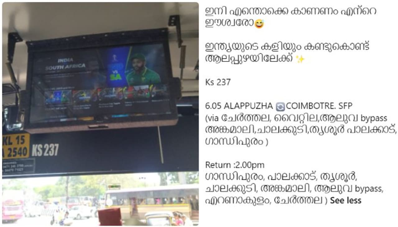 ഇപ്പോള് ഒരു ക്രിക്കറ്റ് ആരാധകന് പങ്കുവെച്ച ഫേസ്ബുക്കില് പങ്കുവച്ച പോസ്റ്റാണ് വൈറലായിരിക്കുന്നത്. ഓടി കൊണ്ടിരിക്കുന്ന കെഎസ്ആര്ടിസി ബസില് ഇരുന്നാണ് ആരാധകന് ഇന്ത്യ - ദക്ഷിണാഫ്രിക്ക മത്സരം കാണുന്നത്. അതിലെന്താണ് അത്ഭുതമെന്ന് തോന്നിയേക്കാം. മത്സരം കാണുന്നത് മൊബൈലിലല്ല. ബസില് പ്രത്യേകം ഘടിപ്പിച്ച ടിവിയിലൂടെയാണ് ആരാധകന് മത്സരം ആസ്വദിക്കുന്നത്. ആലപ്പുഴ - കൊയമ്പത്തൂര് സൂപ്പര് ഫാസ്റ്റിലാണ് സംഭവം. ആരാധകന്റെ പോസ്റ്റിന് താഴെ രസകരമായ നിരവധി കമന്റുകളും വന്നിട്ടുണ്ട്. ഈ പരിപാടി കൊളളാം എന്നൊക്കെയാണ് പലരും പറയുന്നത്. അതിനുള്ള ഡാറ്റ ജീവനക്കാരുടെ പോക്കറ്റില് നിന്നാണോ എന്ന് മറ്റൊരു രസകരമായ കമന്റ്. ബസ് ജീവനക്കാരന് ക്രിക്കറ്റ് ഭ്രാന്തനാണെന്ന് മറുപടിയും.
