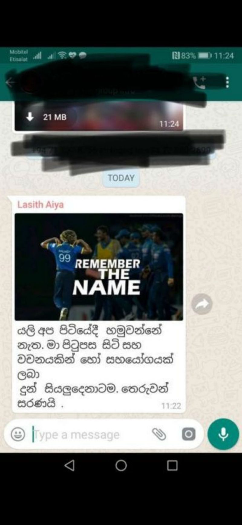ഇന്നലെ രാവിലെ 11.22നാണ് ഗ്രൂപ്പില് സന്ദേശം എത്തിയത്. ശ്രീലങ്കന് ടീമിന്റെ മുഖ്യ സെലക്ടറായ അശാന്ത ഡി മെല് ഇതിന് ഒരു മണിക്കൂര് മുമ്പ് ക്യാപ്റ്റനല്ലെങ്കിലും ലോകകപ്പില് കളിക്കാന് മലിംഗയുണ്ടാവുമോ എന്ന് താരത്തെ ഫോണില് വിളിച്ച് ചോദിച്ചിരുന്നു. ഇതിനുശേഷം വന്ന സന്ദേശമാണെന്നതിനാല് മലിംഗ വിരമിക്കല് പ്രഖ്യാപിക്കുമെന്നാണ് സൂചന.