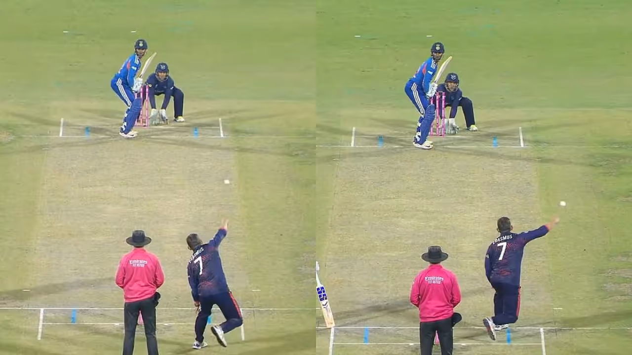 മത്സരത്തിലെ എട്ടാം ഓവറിലായിരുന്നു നാടകീയ സംഭവങ്ങൾ അരങ്ങേറിയത്. 7ഓവറില് ഇന്ത്യ 100 കടന്നതിന് പിന്നാലെ തന്റെ ആദ്യ പന്തില് തന്നെ ഇറാസ്മസ് ഇഷാന് കിഷന്റെ വിക്കറ്റെടുത്തിരുന്നു. അതിന് പിന്നാലെ ഓരോ പന്തിലും വ്യത്യസ്ത ആക്ഷനുകളും വ്യത്യസ്ത റണ്ണപ്പുമായി ഇറാസ്മ്സ് ഇന്ത്യൻ ക്യാപ്റ്റൻ സൂര്യകുമാര് യാദവിനെയും തിലക് വര്മയെയും വെള്ളം കുടിപ്പിച്ചു. ചില പന്തുകള് സൈഡ് ആം ആക്ഷനില് എറിഞ്ഞപ്പോള് ചില പന്തുകള് ബൗളിംഗ് ക്രീസിനും ഏറെ പുറകില് നിന്നായിരുന്നു ഇറാസ്മസ് എറിഞ്ഞത്. ഇത് അമ്പയറുമായി തര്ക്കത്തിനും വഴിവെച്ചു. ആദ്യ ഓവറിലെ അവസാന പന്ത് ഇറാസ്മസ് ബൗളിംഗ് ക്രീസിനും ഏറെ പുറകില് നിന്നെറിഞ്ഞപ്പോള് അമ്പയര് റോഡ് ടക്കര് ഡെഡ് ബോള് വിളിച്ചതാണ് തര്ക്കത്തിന് കാരണമായത്.