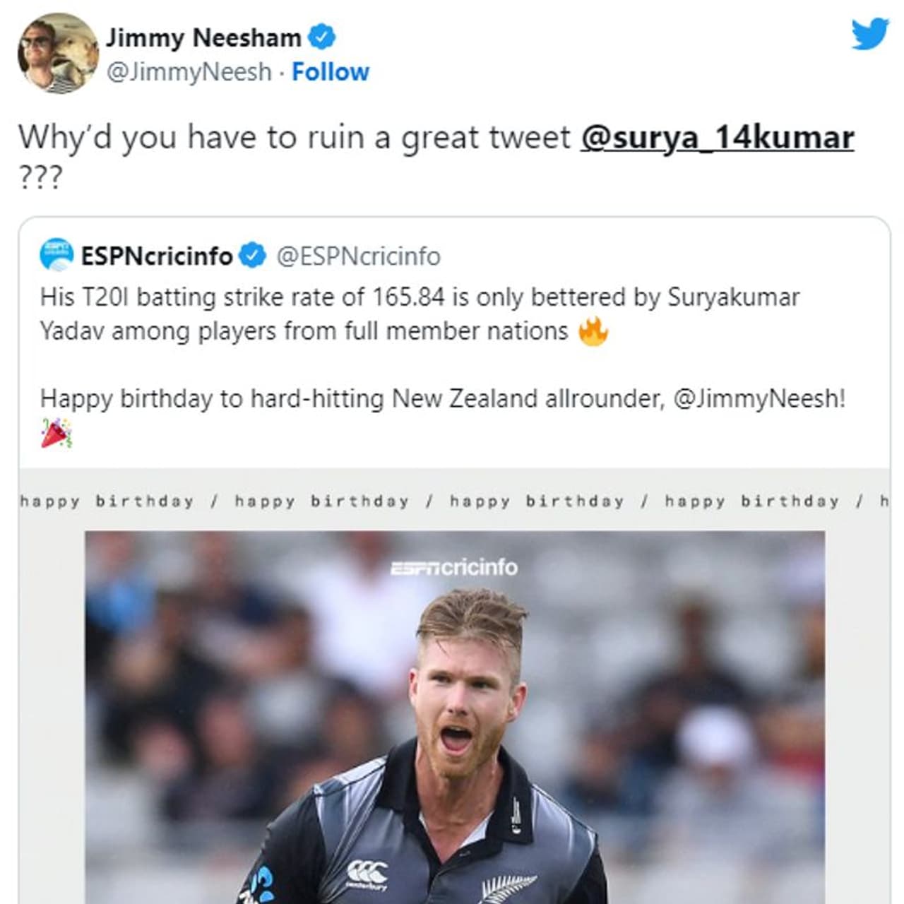 പ്രമുഖ സ്പോര്ട്സ് പോര്ട്ടലായ ഇഎസ്പിഎന് ക്രിക്ക്ഇന്ഫോ അയച്ച പിറന്നാള് സന്ദേശത്തിന് നീഷം നല്കിയ മറുപടിയാണ് ഇപ്പോള് വൈറലായിരിക്കുന്നത്. സന്ദേശം ഇങ്ങനെയായിരുന്നു... ''165.84 സ്ട്രൈക്ക് റേറ്റിലാണ് നീഷം ടി20 ക്രിക്കറ്റില് ബാറ്റ് ചെയ്യുന്നത്. ഐസിസി മുഴുവന് സമയ അംഗത്വമുള്ള ടീമുകളില് നിന്ന് ഇന്ത്യയുടെ സൂര്യകുമാര് യാദവിന് മാത്രമാണ് ഇതിനേക്കാള് മികച്ച സ്ട്രൈക്ക് റേറ്റുള്ളത്. ന്യൂസിലന്ഡ് ഓള്റൗണ്ടര്ക്ക് ജന്മദിനാശംസകള്.'' ഇതായിരുന്നു അവരുടെ സന്ദേശം.