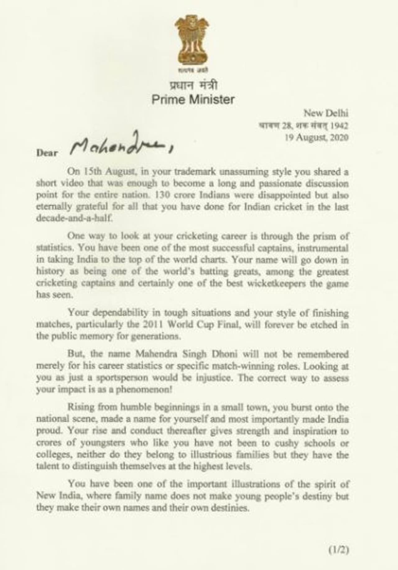 ഇന്ത്യയെ ലോകത്തിന്റെ നെറുകെയിലേക്ക് കൈപിടിച്ചുയര്ത്തിയതും നിങ്ങളാണ്. ലോകത്തിലെ മഹാന്മാരായ ക്രിക്കറ്റര്മാര്ക്കൊപ്പം നിങ്ങളുടെ പേരും ചാര്ത്തപ്പെടും. ലോകത്തെ മികച്ച ക്യാപ്റ്റന്, മികച്ച വിക്കറ്റ് കീപ്പര്, മികച്ച ബാറ്റ്സ്മാന് എന്നിങ്ങനെയുള്ളവരുടെ പട്ടികയിലെല്ലാം താങ്കളുടെ പേരുണ്ടാവും. ഇന്ത്യയിലെ ചെറിയ പട്ടണത്തില് നിന്നും വന്ന താങ്കള് രാജ്യത്തിന്റെ അഭിമാനമുയര്ത്തി. കോടികളോളം വരുന്ന യുവാക്കള്ക്ക് പ്രചോദനമാണ് നിങ്ങളുടെ ക്രിക്കറ്റ് കരിയര്.'' ഇത്രയുമായിരുന്നു കത്തിലെ ഉള്ളടക്കം.