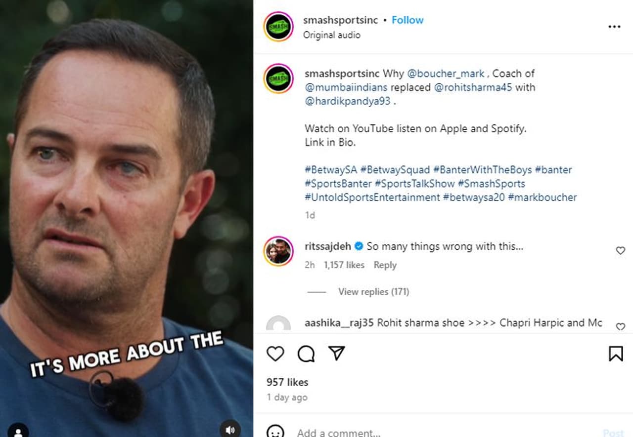 സ്മാഷ് സ്പോര്സ്ടിന് നല്കിയ അഭിമുഖത്തിലായിരുന്നു ബൗച്ചറുടെ പ്രതികരണം. ഇതിന്റെ വീഡിയോ സ്മാഷ് സ്പോര്ട്സ് ഇന്സ്റ്റഗ്രാമിലും പോസ്റ്റ് ചെയ്തിരുന്നു. ഇതിന് താഴെയാണ് റിതിക പ്രതികരണവുമായി എത്തിയത്. എന്തുകൊണ്ട് രോഹിത്തിനെ മാറ്റി ഹാര്ദ്ദിക്കിനെ ക്യാപ്റ്റാനാക്കി എന്ന കാര്യത്തില് ബൗച്ചര് നല്കിയ വിശദീകരണ വീഡിയോയുടെ താഴെ ഇതില് പറയുന്നത് പലതും തെറ്റാണെന്നാണ് റിതിക പ്രതികരിച്ചിരിക്കുന്നത്.
