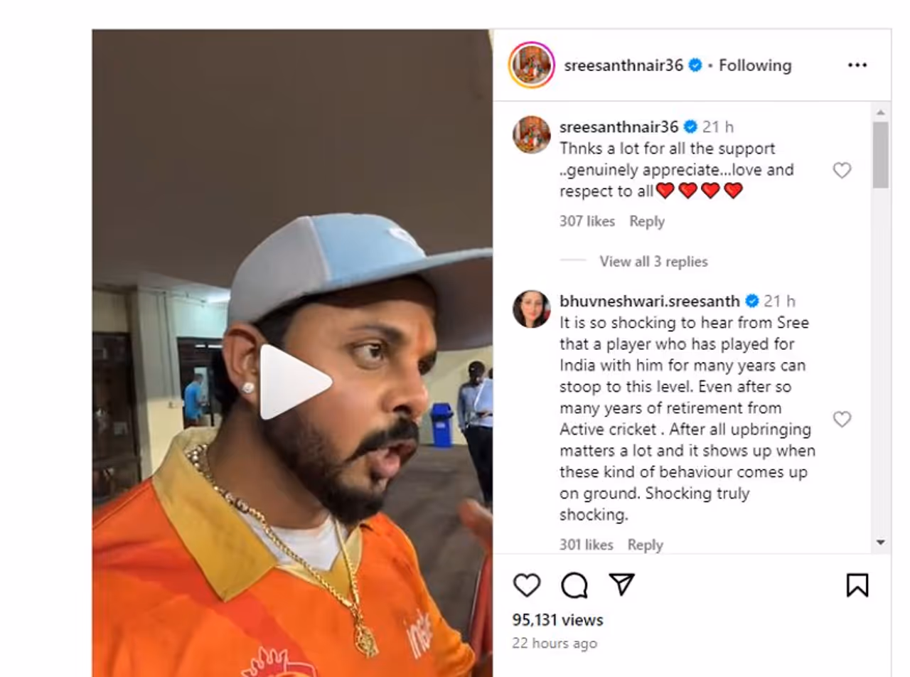 ലെജന്ഡ്സ് ലീഗ് ക്രിക്കറ്റിലെ എലിമിനേറ്റര് പോരാട്ടത്തില് ഇന്ത്യ ക്യാപിറ്റല്സും ഗുജറാത്ത് ജയന്റ്സും തമ്മിലുള്ള മത്സരത്തിനിടെയാണ് ഗൗതം ഗംഭീറും എസ് ശ്രീശാന്തും തമ്മില് വാക്കുതര്ക്കമുണ്ടായത്. ഇന്ത്യ ക്യാപിറ്റല്സ് നായകന് കൂടിയായ ഗംഭീര് തന്നെ ഒത്തുകളിക്കാരനെന്ന് വിളിച്ച് അപമാനിച്ചുവെന്ന് ശ്രീശാന്ത് ഇന്സ്റ്റഗ്രാം വീഡിയോയിലൂടെ വെളിപ്പെടുത്തിയിരുന്നു. ഈ വീഡിയോയ്ക്ക് താഴെയാണ് ശ്രീശാന്തിന്റെ ഭാര്യ ഗംഭീറിനെതിരെ പരസ്യമായി രംഗത്തുവന്നത്.