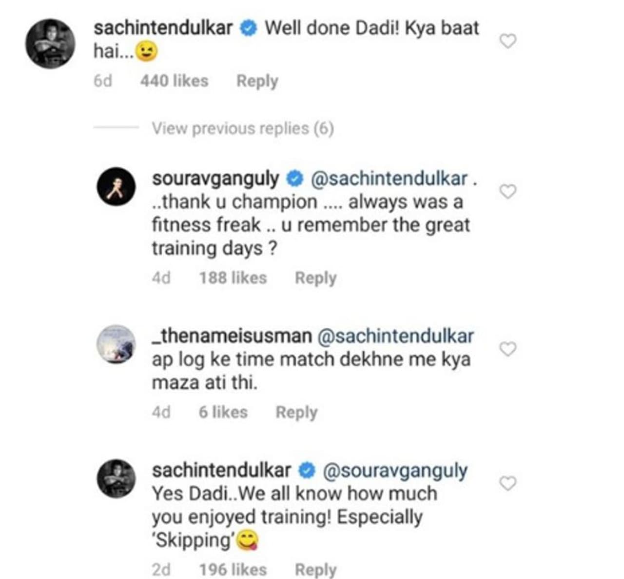 ഇതിന് താഴെ ദാദയെ കളിയാക്കുന്ന കമന്റുമായി ആദ്യമെത്തിയത് സച്ചിന് തന്നൊയയിരുന്നു. തണുത്ത പ്രഭാതത്തില് വ്യായാമം നല്ലതാണ്, ഫ്രഷായിരിക്കാന് എന്നായിരുന്നു ചിത്രം പോസ്റ്റ് ചെയ്ത് ഗാംഗുലിയിട്ട അടിക്കുറിപ്പ്. ഇതിന് താഴെ വളരെ നല്ലത് ദാദ, എന്താ ഇത് എന്ന് ചോദിച്ച് സച്ചിന് രംഗത്തെത്തി.