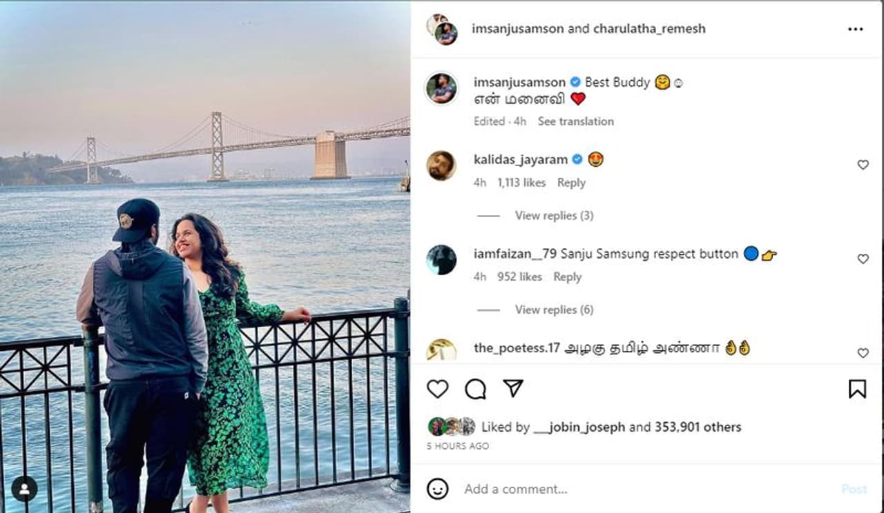 ഐപിഎല്ലിലെ മിന്നും താരമായതിനാല് സാമൂഹ്യമാധ്യമങ്ങളില് വലിയ ആരാധക പിന്തുണയുള്ള താരമാണ് രാജസ്ഥാന് റോയല്സ് നായകന് സഞ്ജു സാംസണ്. അതിനാല് നിരവധി ആരാധകരാണ് ഇന്സ്റ്റയില് സഞ്ജുവിന്റെയും ചാരുവിന്റേയും ചിത്രത്തിന് താഴെ കമന്റുകളുമായി പ്രത്യക്ഷപ്പെട്ടിരിക്കുന്നത്. സഞ്ജുവിന്റെ തമിഴിനെ പ്രശംസിക്കുന്ന ആരാധകരുമുണ്ട്. റോയല്സിലെ സഹതാരം രവിചന്ദ്ര അശ്വിനൊപ്പം തമിഴ് സഞ്ജു നന്നായി സംസാരിക്കുന്ന വീഡിയോ മുമ്പ് വൈറലായിരുന്നു. സൂപ്പര് സ്റ്റാര് രജനീകാന്തിന്റെ ആരാധകനായ സഞ്ജുവിന് തമിഴ് അറിയാതിരിക്കുമോ എന്നായിരുന്നു ചിത്രത്തിന് ഒരു ആരാധകന്റെ കമന്റ്. കോളേജ് കാലത്ത് മൊട്ടിട്ട പ്രണയത്തിനൊടുവില് 2018ലാണ് സഞ്ജു സാംസണും ചാരുതലയും വിവാഹിതരായത്.
