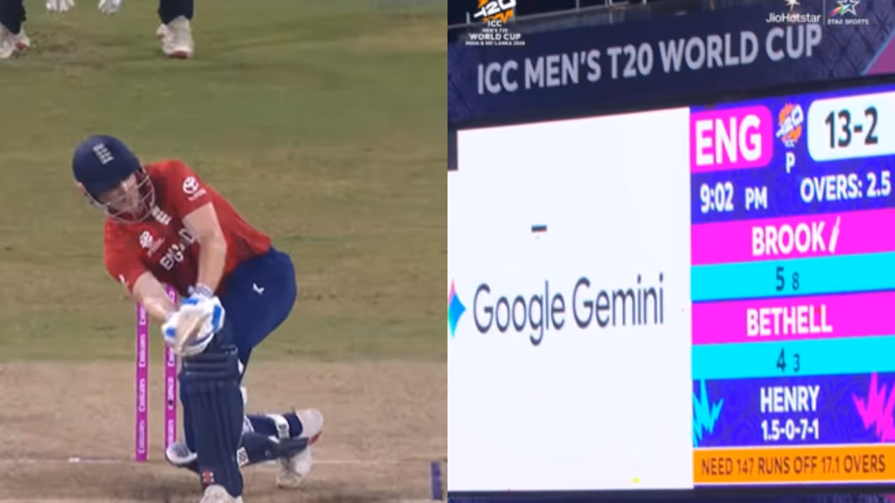 വെള്ളിയാഴ്ച നടന്ന മത്സരത്തിൽ ഇംഗ്ലണ്ടിന്റെ റൺ ചേസിനിടെ മൂന്നാം ഓവറിലായിരുന്നു സ്കൂപ്പ് സിക്സിലൂടെ ഞെട്ടിച്ചത്. മാറ്റ് ഹെൻറിയുടെ പന്തിനെ ഓഫ് സൈഡിലേക്ക് നീങ്ങിനിന്ന് സ്കൂപ്പ് ചെയ്ത ബ്രൂക്ക്, സ്ക്വയർ ലെഗിന് മുകളിലൂടെ പായിക്കുകയായിരുന്നു. ഗാലറിയിലുണ്ടായിരുന്ന വമ്പൻ സ്ക്രീനിൽ പന്ത് കൊണ്ടതോടെ സ്ക്രീനിലെ ഡിസ്പ്ലേയിൽ പൊട്ടലുണ്ടായി. ഇതിന്റെ വീഡിയോ ഇപ്പോൾ സോഷ്യൽ മീഡിയയിൽ വൈറലാണ്.